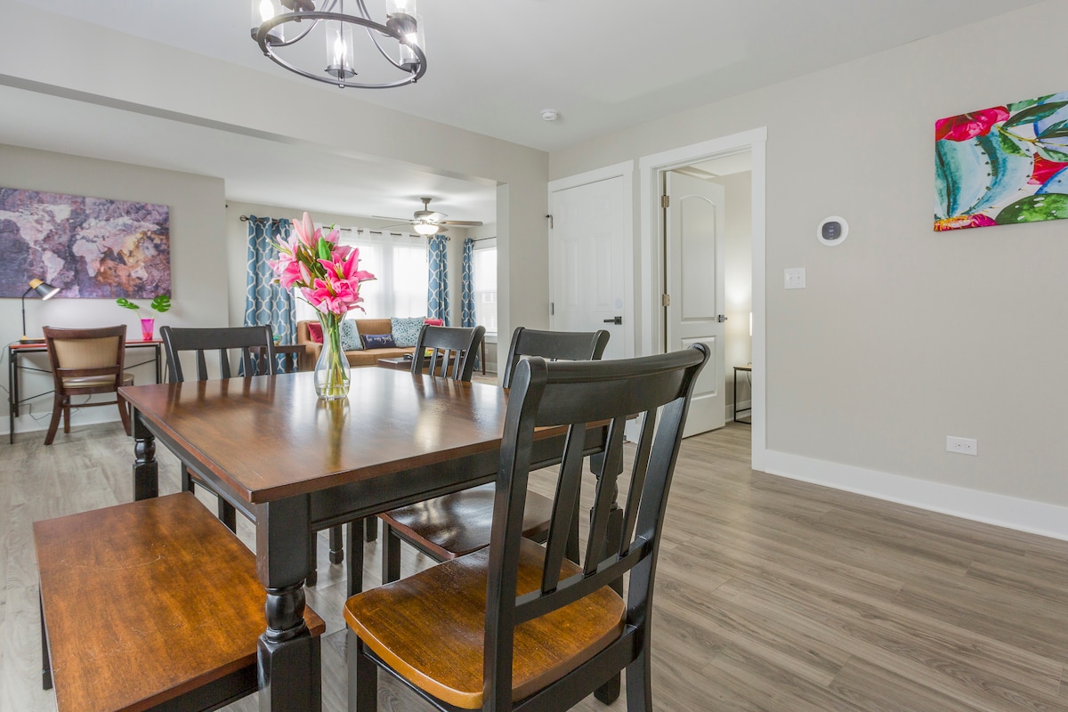 Upplev staden med stil i Retro Modern Bungalow, den perfekta platsen för upp till 4 vänner. Med två rymliga sovrum – båda med en dubbelsäng och lyxiga sängkläder – en propaneldstad och en fullt inhägnad, valpvänlig bakgård. Njut av central VVS, snabbt wifi och en dedikerad arbetsyta. En pack-n-play-spjälsäng är tillgänglig utan kostnad. Centralt läge strax söder om Oak Park, 15 minuter från Midway flygplats och 20 minuter från centrum. Parkera gratis i vårt garage eller ta tåget några kvarter bort.