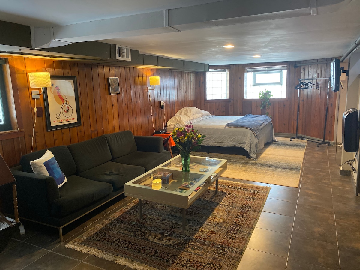 Cozy English garden apt (300 sq ft) w/ priv. entrance & free offstreet prking. 4 min walk to Blue Line. Brightly lit / high ceiling. Adjustable Tempupedic memory foam QUEEN bed plus futon in lvng rm. Kitchenette w/ mini-frig, Nespresso & Keurig, toastr ovn, microwv, and waffle maker w/maple syrp. Designer bath. 30+ restaur/bar nearby (see GUIDE BK in LOCATION). Self check-in. Flexible cancel. Early lugg. drop. A space to unwind in -- art-filled and artistic in design, NOT bland or IKEA like!
