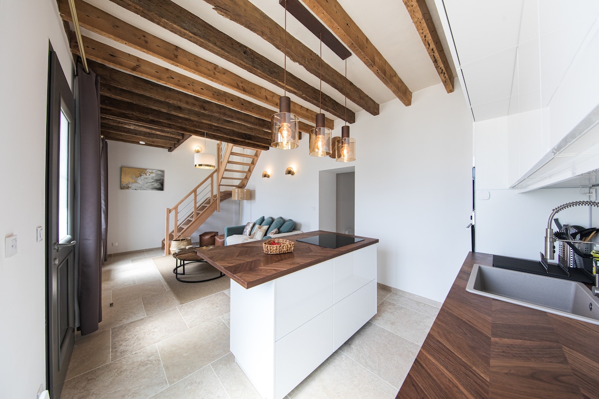 Gammalt restaurerat vinodlarhus på vägen till Loire med cykel. Fristående och luftkonditionerad anläggning. Du har hela boendet för dig själv. På bottenvåningen finns ett kök med fönsterbåge med utsikt över poolen, utrustad med vardagsrum (bäddsoffa), badrum med badkar och bastu. På övervåningen finns ett mycket stort och bekvämt sovrum (en queen size-säng och en bäddsoffa) med ett vardagsrum och TV-hörna. Gratis WiFi Säker parkering med elektrisk grind