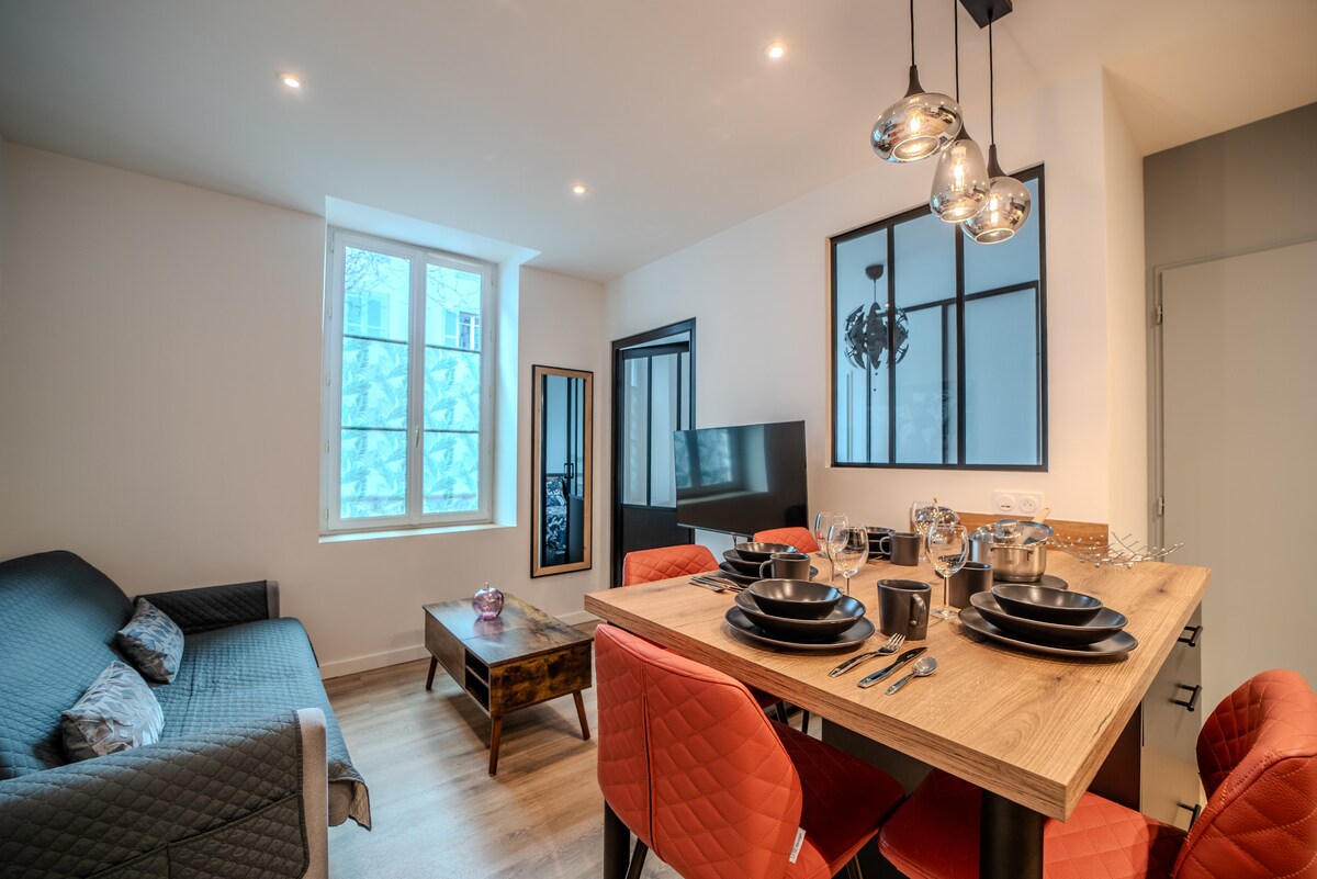 Vår lägenhet på 45 kvm, (2: a våningen utan hiss), totalrenoverad i maj 2023, drar nytta av en privat skyddad terrass på 17 m2 Idealiskt beläget i stadens centrum, under arkaderna (historiska hjärtat av Lons), har det utsikt över en lugn innergård, med alla butiker och restauranger i omedelbar närhet Den är designad av en arkitekt och har utformats och optimerats på ett sätt som ger dig optimal komfort Allt du behöver göra är att lämna av ditt bagage för att njuta fullt ut av Jura!