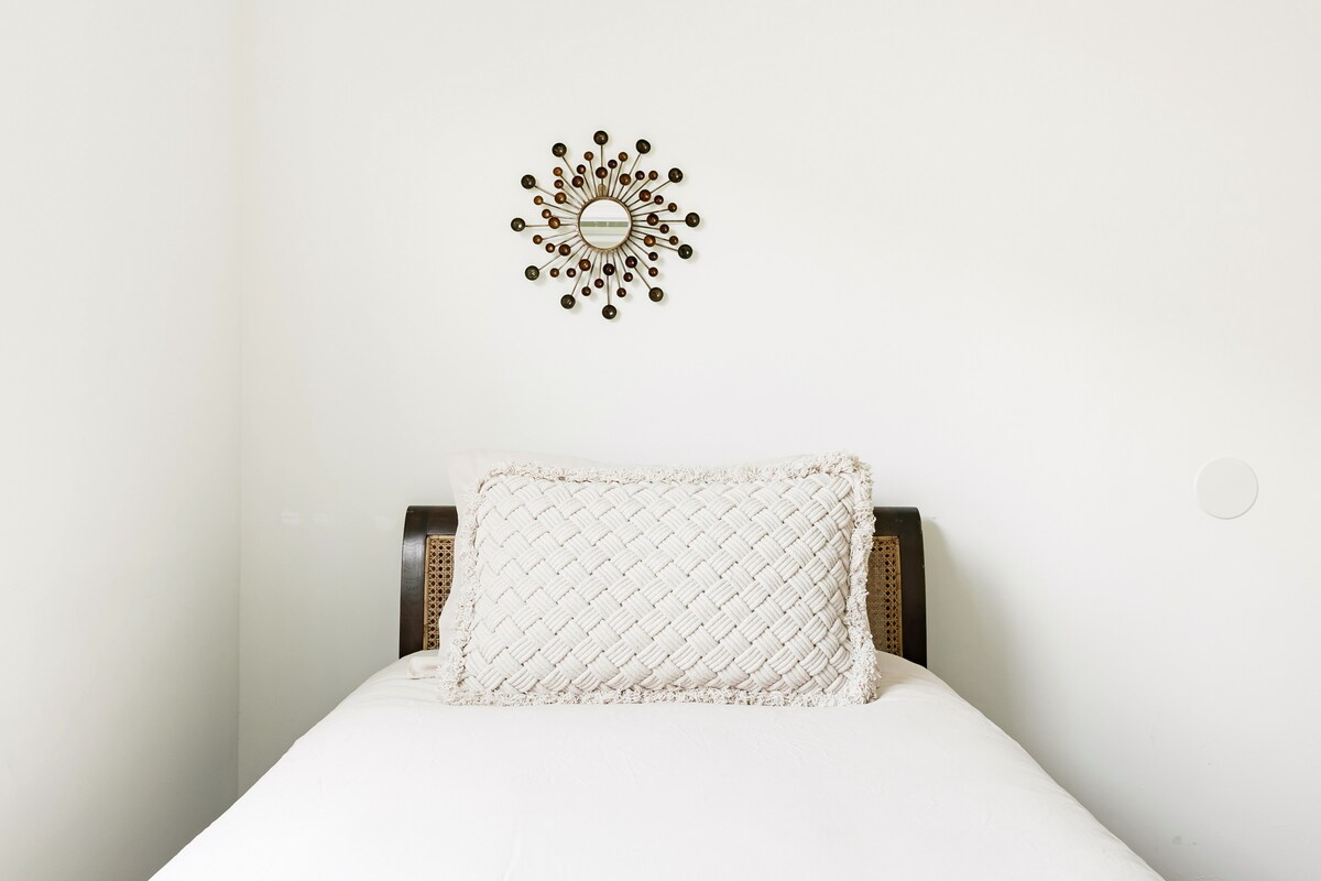 Gör dig redo för dagen med en morgondrink på trädhusets terrass, koppla sedan av i badkaret eller ta en paus under de välvda taken i det luftiga vardagsrummet efter en dags sightseeing i LA. Samtida konstverk och en djärv väggmålning i sovrummet kontrasterar med ett elegant kök och fräscha, vita väggar. Detta är ett mycket speciellt utrymme; stort, ljust, modernt och mycket privat. En fristående byggnad inbäddad bakom vårt spanska uppvaknande hem i ett lugnt Burbank grannskap. Valvat tak med takfönster. Helt nytt badrum med regndusch och badkar. Stort vardagsrum och pentry och ett stort sovrum med gott om förvaring. Det finns dedikerat wi-fi och ett bekvämt kontorsområde. Huset är fyllt med konstverk från LA-konstnärer, för att ta lite av LA-gatorna till bekvämligheterna i Burbank. Gäster kommer att ha tillgång till dedikerat Internet Wi-fi, Roku TV, Netfix, Amazon och HBO, utomhus matplats grillplats. Tvättmaskin och torktumlare är tillgängliga vid behov. Gästhuset är en separat fristående byggnad som ligger bakom huvudhuset med en privat, nyckellös ingång. Vi bor i huvudhuset. Vi ser fram emot att träffa dig! Vi bor i huvudbyggnaden bara några steg bort och kommer att finnas tillgängliga om något skulle uppstå. Upplev det bästa av två världar, med en lugn småstadskänsla i hjärtat av en stor metropol. LA:s livliga sevärdheter ligger i närliggande, men detta pittoreska grannskap är också hem för charmiga butiker och restauranger. - Busshållplats mindre än ett kvarter bort. - North Hollywood tunnelbanestation 3 miles bort. - Universal Studios ligger 15 minuter från vårt hus med bil. - Massor av GRATIS GATUPARKERING. - Mindre än tio minuter från Burbanks flygplats. - Fem minuter från Metrolink/Amtrack station. - Gångavstånd till Burbank och Magnolia Park community. Vårt pensionat är perfekt för branschfolk som behöver vara nära den frenetiska energin i Hollywood, men som fortfarande gillar lugnet och roen i en privat tillflyktsort. För dig som vill utforska Los Angeles ligger vi nära studior, shopping, Griffith Park, kollektivtrafik och alla större genomfarter. Det finns en säng i queen-storlek med en bäddmadrass i minnesskum. En extra enkelsäng kan läggas till i rummet om det behövs. Gästhuset har ett separat kök, men det är inte ett fullt utrustat kök. Det finns ingen spis eller spis. Det finns mikrovågsugn, vattenkokare, brödrost och kyl/frys. För tillfället accepterar vi inte långtidsgäster.