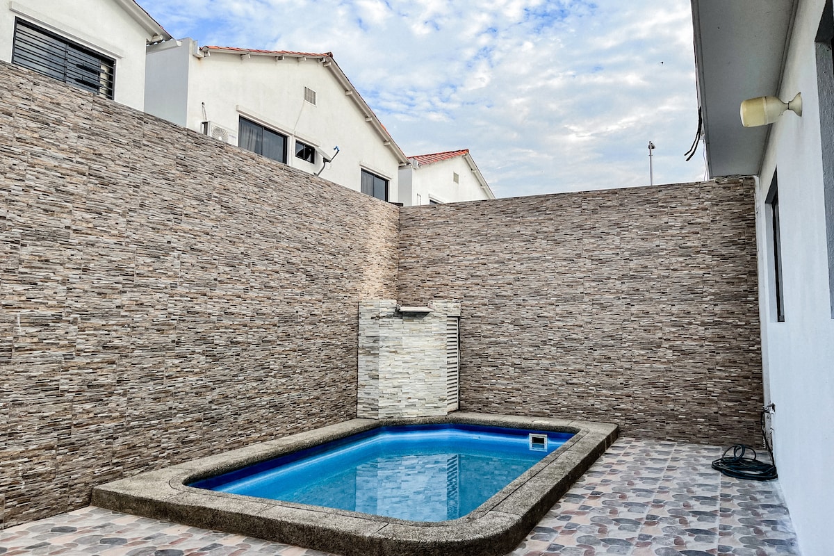 5 minuter från Plaza Batán, i en privat och säker utveckling, hittar du detta rymliga och moderna hus perfekt för familjer eller grupper. Det har en exklusiv pool med ett vattenfall, ett grillområde, ett fullt utrustat kök, 3 sovrum (5 sängar + bäddsoffa), gratis parkering för 5 fordon och säkerhet dygnet runt. Nära till banker, restauranger, shoppingcenter och några minuter från El Dorado shoppingcenter. Ett överlägset val för komfort, integritet och plats.