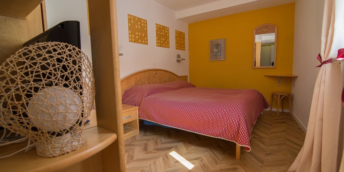 bekvämt dubbelrum med dubbelsäng, badrum, kylskåp, luftkonditionering, SAT/TV. gratis wi-fi strand 300 m marknad 200 m centre town 500 m frukost ingår ej i priset frukost 10,00 euro/person/ dag vegetarisk frukost/ GLUTENFRI FRUKOST