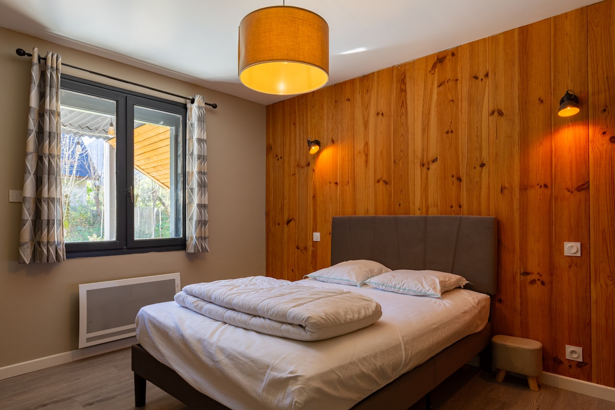 Detta fridfulla boende erbjuder en avkopplande vistelse för hela familjen med terrass, trädgård och mycket vacker utsikt över bergen. Résidence l'orée des monts MYCKET VIKTIGT Tack för att du läser hela annonsen ... sängkläder ingår inte .... för att undvika besvär 200 m från byar och butiker, och alla aktiviteter: Balnea, pedalbåtar paddel kanot, utomhuspool ludeo, skärmflygning ....