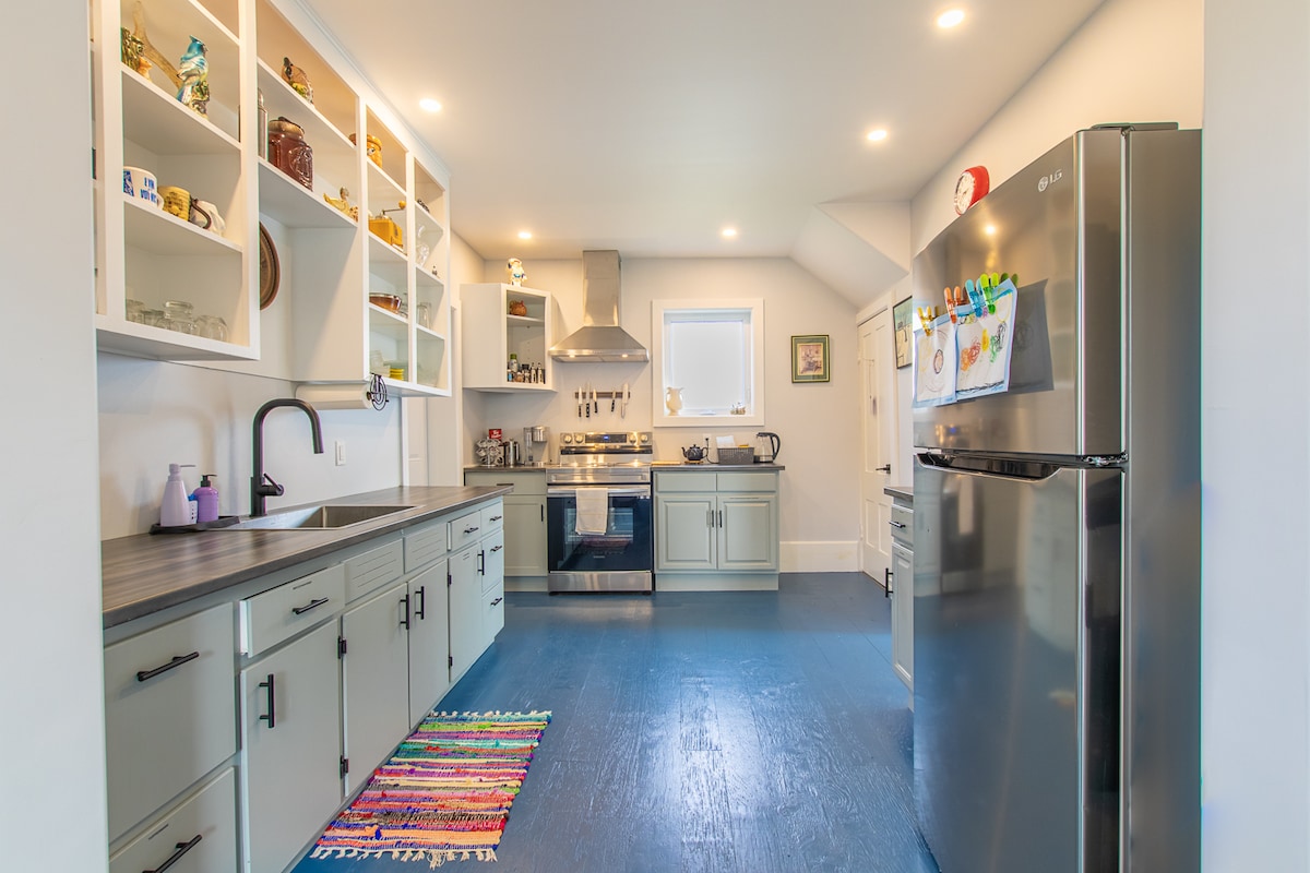 This century old school house is a hidden gem. Nestled at the end of 'School Lane' this building has been converted and is now home to a loft apartment and the offices of a local environmental charity. This gorgeous sunlit loft has been updated with modern fixings but has retained all of it's historic charm. With a fully equipped open concept kitchen, beautiful bathroom with antique clawfoot tub, 14 foot ceilings, 55” TV Netflix Amazon Prime etc+ cozy sunlit bedroom - you'll be right at home