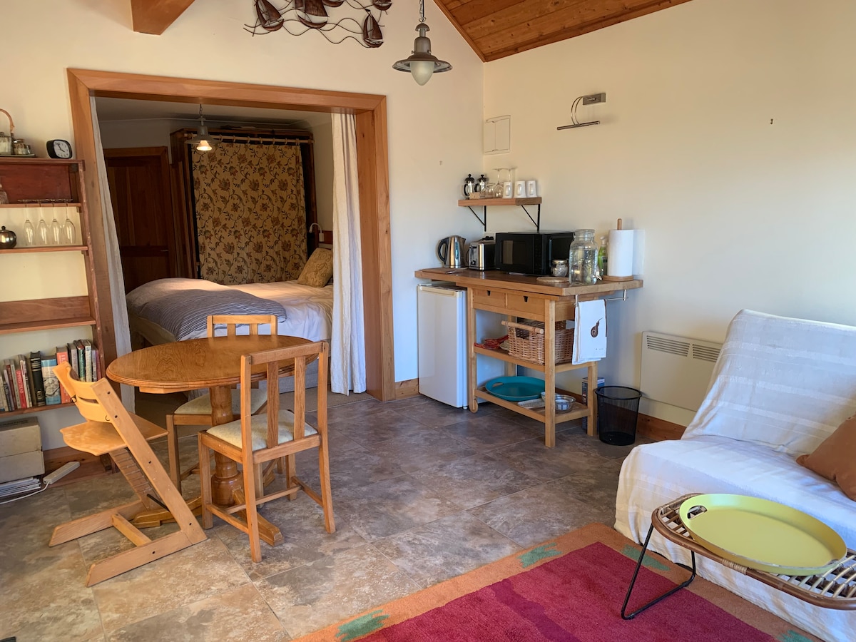 Njut av naturens ljud när du bor på detta unika ställe. Det är en helt ny, välisolerad, dubbelglasad ett sovrums bod vistelse. Om du vill ha en bra sömn finns vår super king size-säng med ny tvättat och utomhustorkat linne här för dig. Endast 20 minuter från Dunedin city. Bra kvalitetscyklar finns att hyra. Utsikten är bra, du tittar rakt på Mihiwaka från däcket till vänster och tittar ner till viken till höger. Det är ett litet livsstilsblock med får och bin.
