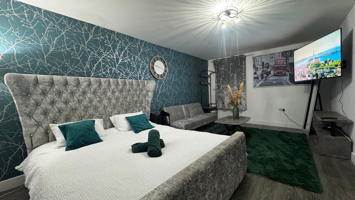 10% RABATT PÅ VECKOVISTELSER Bo i Birminghams Jewellery Quarter i en elegant lägenhet med 1 sovrum med snabbt Wi-Fi, smart-TV och ett bekvämt utrymme att koppla av på. Minuter från centrum med bra förbindelser för arbete eller helgvistelser. 🛏 Avkopplande sovrum för kvalitetssömn 🛋️ 1x bäddsoffa Efter en hektisk dag i staden, kom hem till en lugn lägenhet med: • En bekväm säng för den perfekta nattsömnen • Strykjärn, strykbräda, ångare för att hjälpa till att göra dig redo för en produktiv dag • Fullt utrustat kök