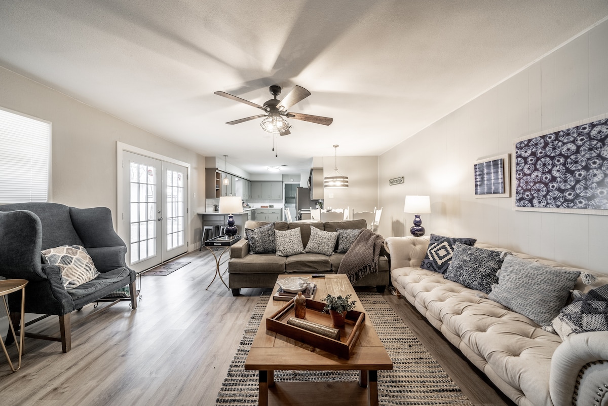 Denna semester med Boho-tema är idealisk för familjer och gruppvistelser! Med fullt utrustat kök, snabbt wifi, två vardagsrum och en 65" SmartTV (gratis Netflix, Hulu, Amazon). Nyligen uppdaterad i hela hemmet med en modern och funktionell atmosfär utformad för gäster att koppla av och varva ner. Vacker bakgård med stora träd, helt inhägnad gräsgård, täckt uteplats och utomhusspel, perfekt för underhållande gäster. Vi ser fram emot din vistelse!