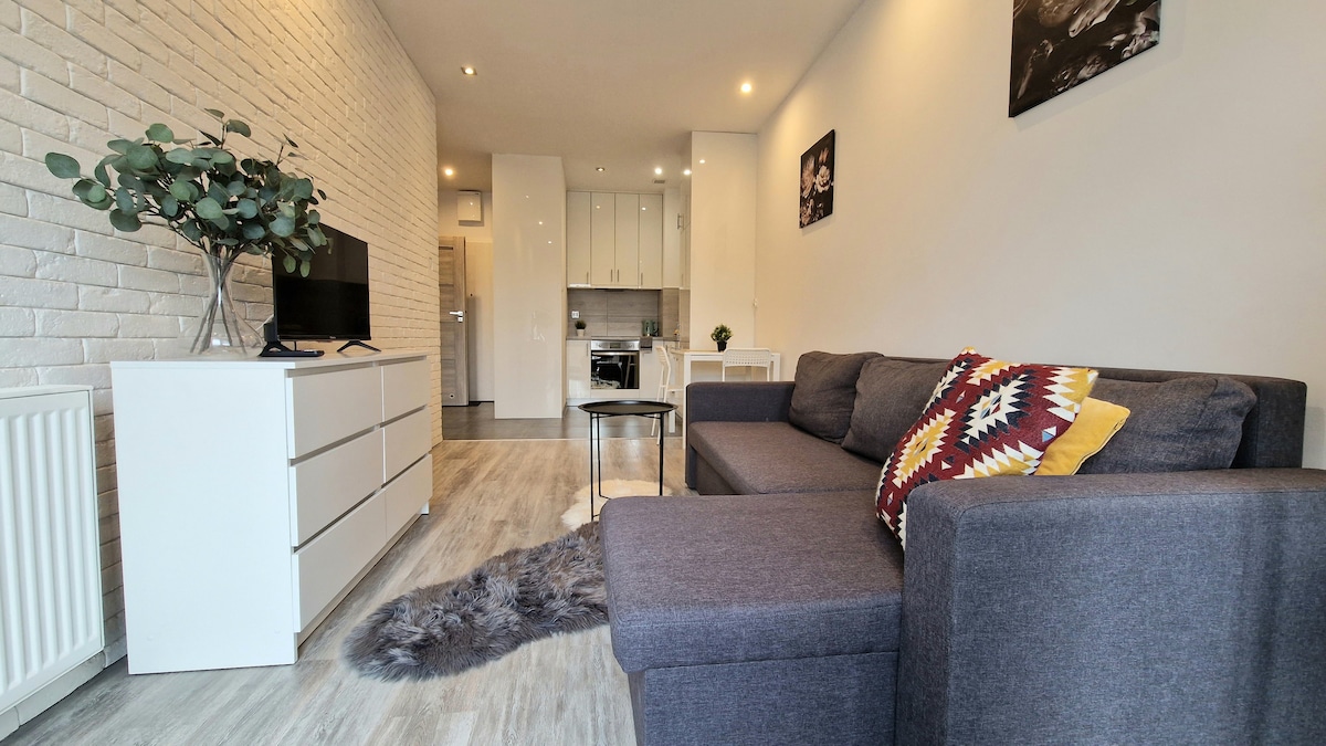 Varma hälsningar. Att hyra en mysig, hög lägenhet med en yta på 30 m2, som ligger 4 km till Gamla Stan och Lublin slott och 1,5 km till tågstationen. Den består av ett stort pentry i anslutning till nattzonen och ett badrum med dusch. Utrustad med 42"TV, Netflix, HBO, WI-FI, kylskåp, tvättmaskin, spis, mikrovågsugn, tallrikar, bestick, rena handdukar och sängkläder. Lägenheten har en dubbelsäng 140x200 cm med en bekväm Ikea-madrass och en extra bäddsoffa.