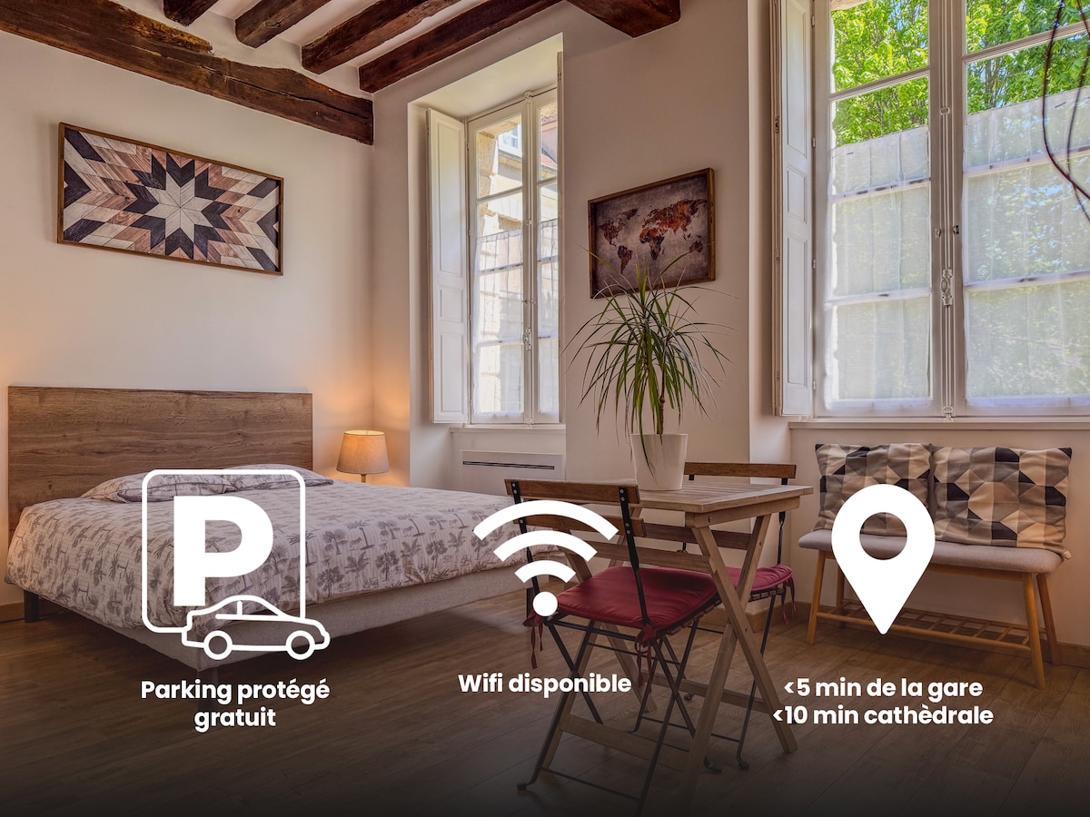 Charmig studiolägenhet som kombinerar gammaldags charm med modern komfort mitt i Chartres. Koppla av på din lugna, 10 m² stora privata terrass efter dina promenader. Perfekt för kaffe i solen, aperitifer på kvällen eller en avkopplande stund. Beläget mitt i gågatan, nära biografen, restauranger och butiker, bara en kort promenad från katedralen och 10 minuters promenad från tågstationen.