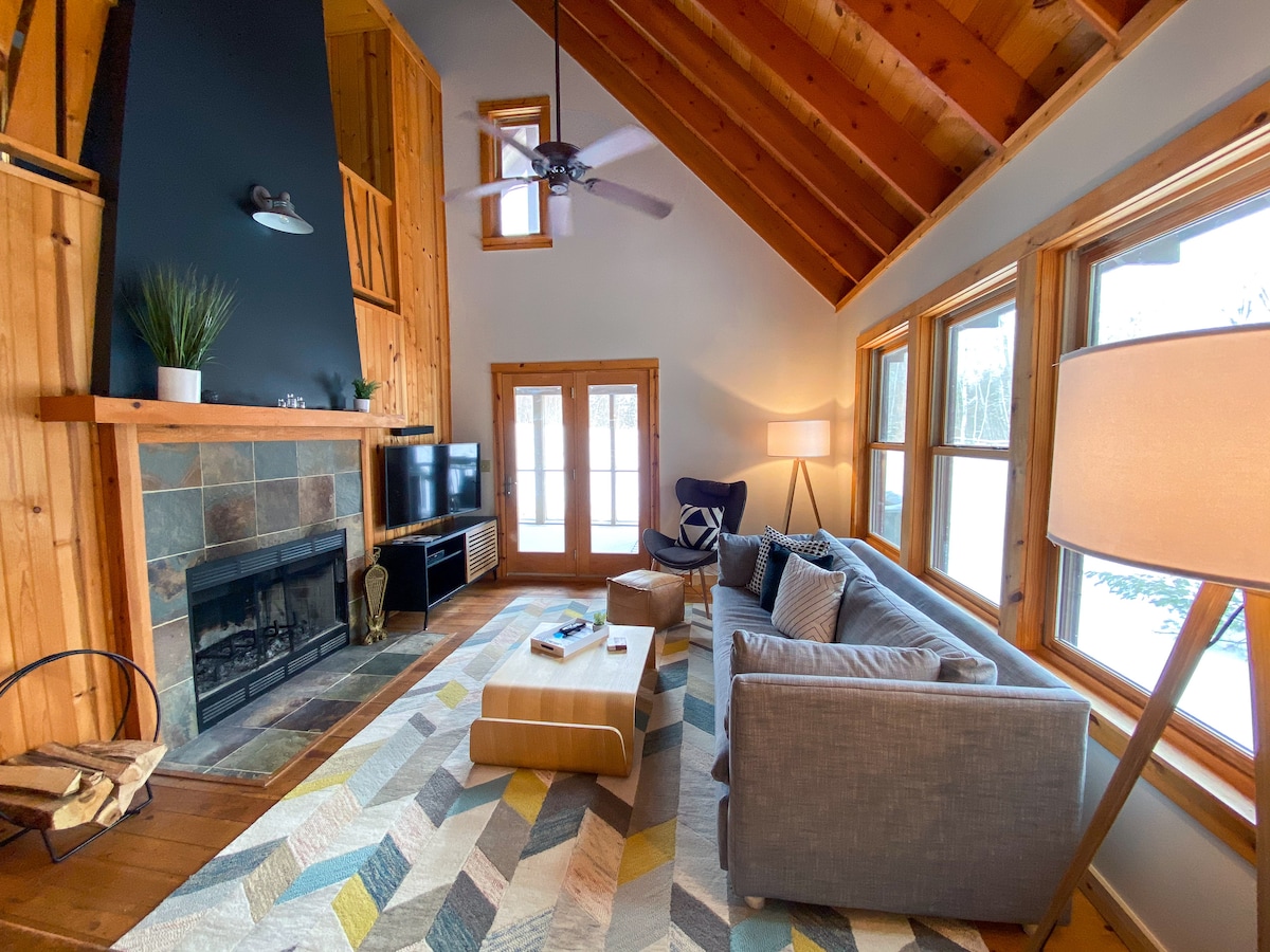 Den nyligen uppdaterade White Pine Chalet har en modern nordisk designestetik och en otroligt mysig layout. Vedeldad öppen spis, ängsutsikt från den avskärmade verandan och helt nya möbler uppifrån och ned.