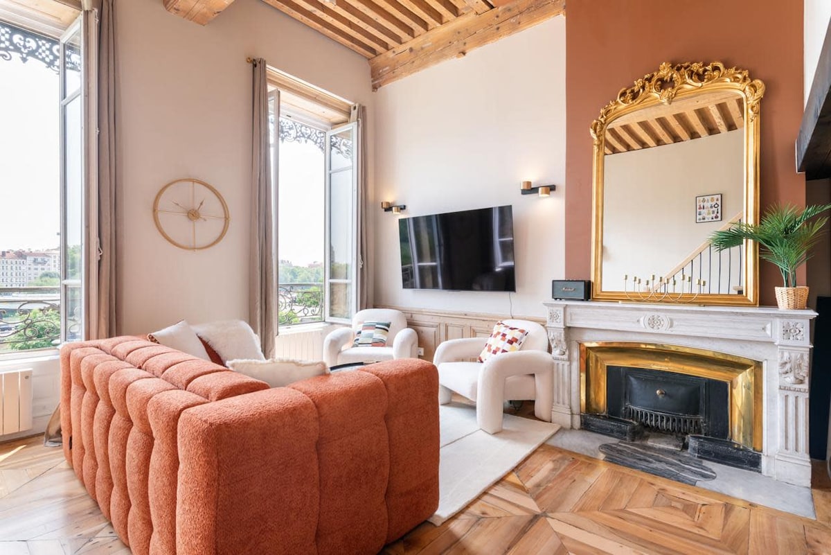 The apartment (45m²+ private patio) is located on the banks of the Saône, a 5-minute walk from the historic old Lyon district. Located on the 1st floor (no elevator), hillside of an old building on the bank of the Saône river, the building corridor is a little rustic (17th century). The apartment has been fully redesigned, keeping its authenticity. I made it my refuge, away from the hustle and bustle of Lyon. However, this place is not to everyone’s taste 😊. I describe later the pros & cons.