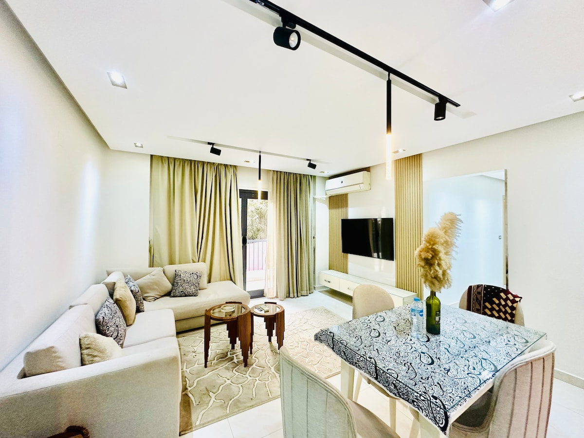 Välkommen till din fridfulla tillflyktsort i det livliga hjärtat av Degla Maadi! Den här eleganta lägenheten ligger i ett utmärkt läge och erbjuder en lugn tillflyktsort för både familjer och resenärer. Kliv in i modern elegans med vårt elegant inredda utrymme, med två mysiga sovrum prydda med plysch sängkläder för en lugn natts sömn. Det fullt utrustade köket lockar till kulinariska äventyr, medan det bekväma vardagsrummet inbjuder till avkoppling efter en dags utforskning av Kairo livliga gator.