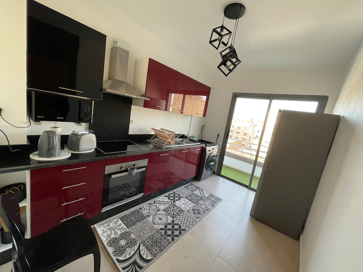 Perla 403💎, en fristad där elegansen i en modern bostad kombineras med komforten i 5-stjärniga hotell i hjärtat av Casablanca! Koppla av i ett rymligt vardagsrum med modern design, utrustat med en 55-tums smart-TV med Netflix och IPTV för kvällar av absolut avkoppling. Sovrummet, ett riktigt mysigt bo, lovar dig lugna och vilsamma nätter ☁️ Från din privata balkong kan du njuta av de fantastiska solnedgångarna över staden, vilket gör varje ögonblick av din vistelse oförglömlig! ✨