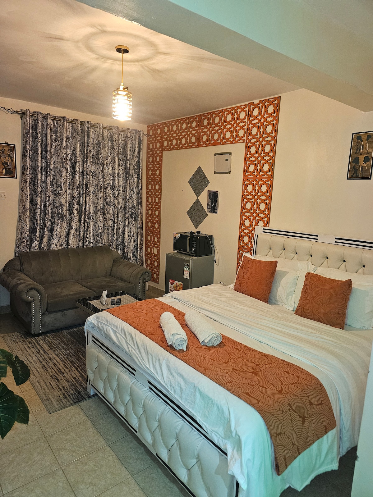 Charmigt modernt pensionat med 2 sovrum, master ensuite, hemmakontor och nära till fantastiska köpcentra. Perfekt för helgutflykt, vistelse, affärsresa, arbete hemifrån alternativ eller mysig hemmabas medan du utforskar vårt vackra Nairobi. Oslagbart läge med Express Way, JKIA Int. Flygplats, Standard Gauge järnvägsstation bara några minuter bort. Det finns ett litet öppet fält inom egendomen där du kan välja att jogga, motionera eller bara ta en rask promenad.