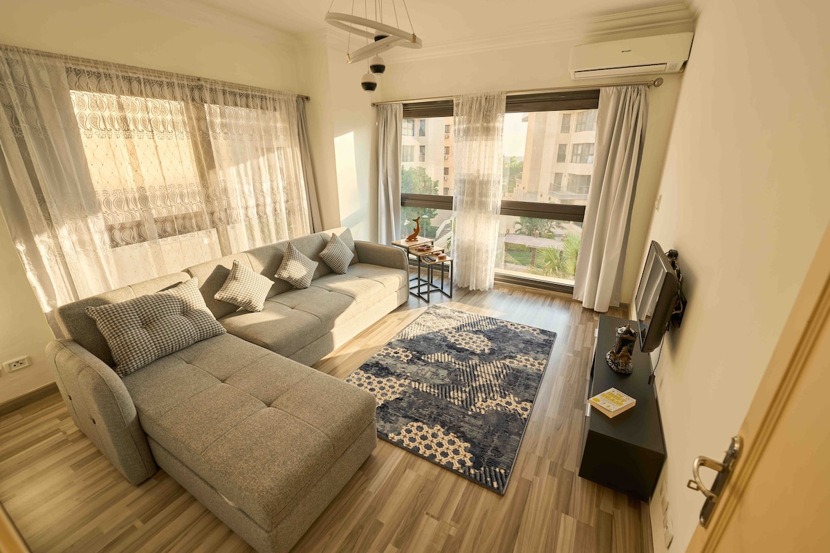 Upplev lyx i denna moderna möblerade lägenhet med 2 sovrum/2 badrum och utsikt över trädgården. Ha kul med hela familjen på detta eleganta ställe. Bara 10 minuter från det största utomhuscentret i Mellanöstern, East Hub Mall och Craft Zone med butiker och kaféer. Endast 25 minuter från flygplatsen och nära Madinaty Club och grönområden. Uber är tillgängligt dygnet runt, och appar som Talabat och InstaShop levererar mat och livsmedel när som helst. Perfekt för dig som värdesätter kvalitet och bekvämlighet. Boka nu!