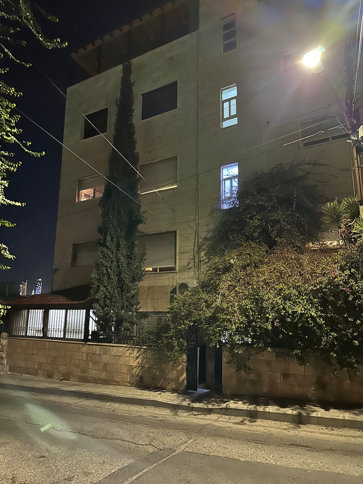 Du kommer att befinna dig i en vintage anläggning som byggdes på 40-talet. Nyrenoverad på ett sätt som bevarade vintage stil, med en modern twist. Det är totalt 14 hyresenheter, 3 takterrasser, trädgård, utegym, utomhuskök och ett tvättrum. Platsen ligger i Jabal Amman, ett av de äldsta områdena i Amman! Det är 1 minuts promenad till Rainbow Street, 15 minuter till centrum. Fantastisk utsikt över gamla stan från taket!