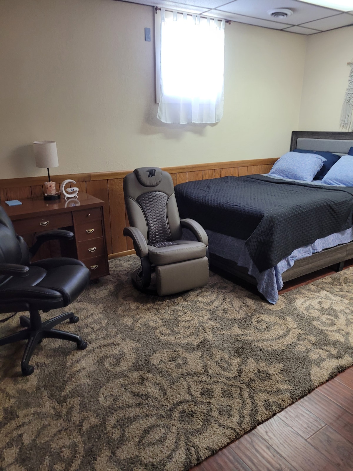 Deeply relax in this Vastu Chalet by the Lake. Enjoy the unique energy of this World Peace community near the Peace Palace and The Raj. Walk on trails around two man-made lakes. A 5-miles drive to Fairfield, MIU, and all downtown attractions. Enjoy the entire private top floor of this duplex. A 14-step, outdoor staircase leads to your apartment. Main room offers kitchen, dining area, two beds, a couch. Full bathroom with shower and tub + washer & drier. Master bedroom with Queen-size bed.