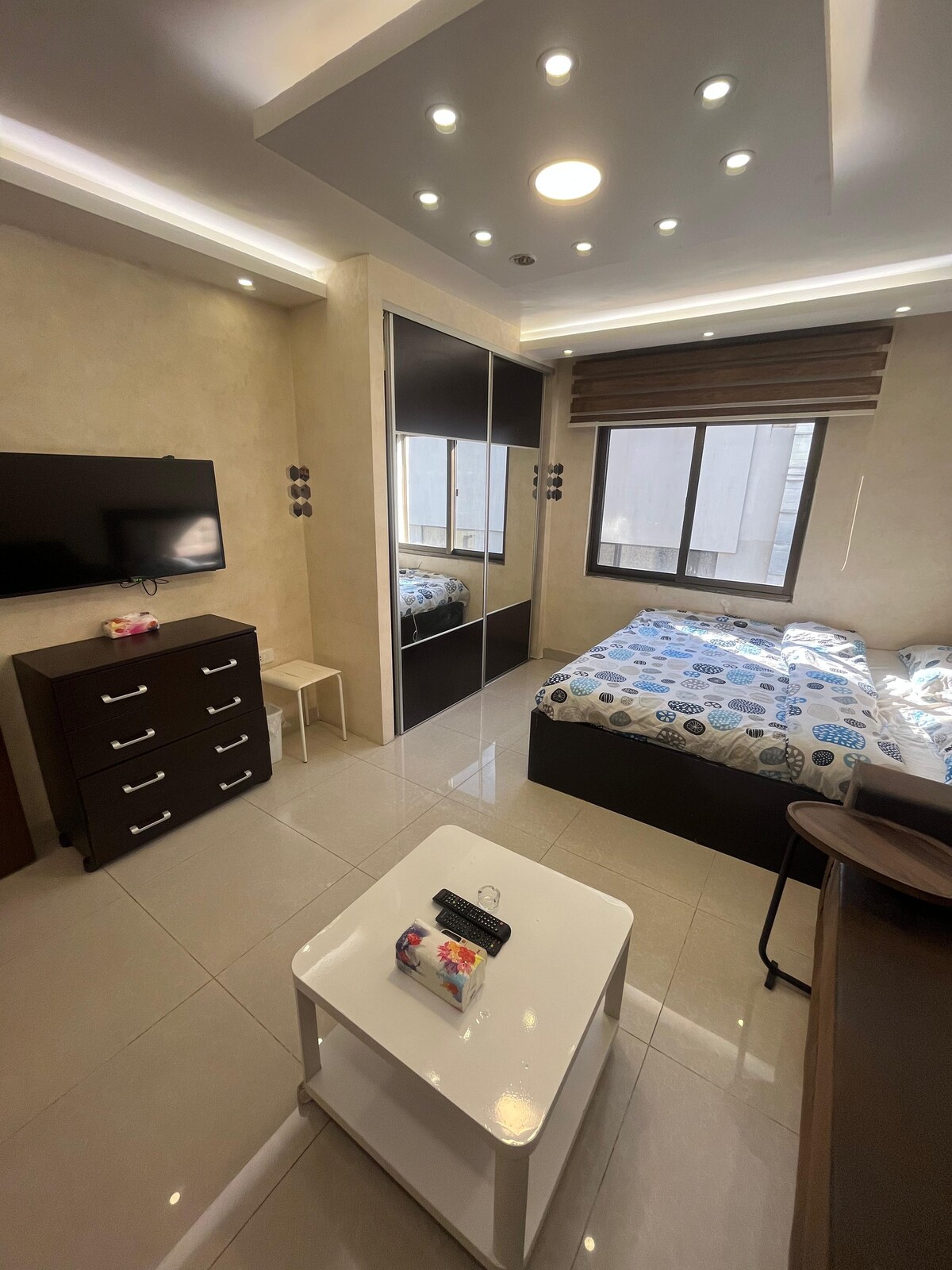 Välkomna till denna mysiga och moderna studio, perfekt för en bekväm vistelse i Amman. Beläget bekvämt nära gallerior, restauranger och kaféer, har du enkel tillgång till de bästa shopping och tjänster. Utrustad med allt du behöver för att känna dig som hemma. Studion har en kokvrå med alla väsentligheter, luftkonditionering och TV för din underhållning. Badrummet är elegant och modernt, med dusch. Kliv ut på den rymliga terrassen som erbjuder en fantastisk utsikt över Ammans skyline med grillplats.