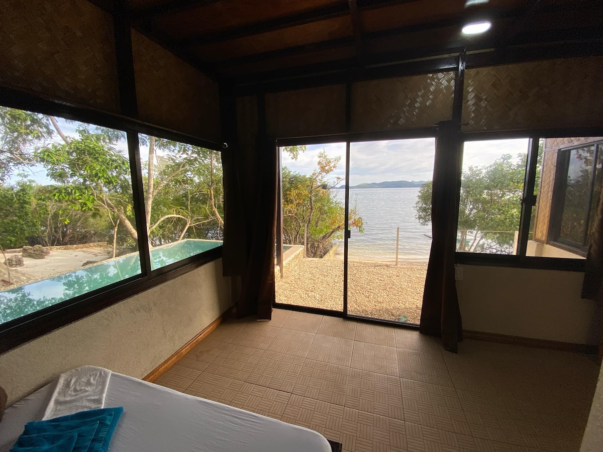 Fly till Amansinaya Beach House på Tambon Island, Culion – ett fridfullt hem vid stranden med en lång brygga, färgglada koraller och vild natur överallt. Värd för vänliga vaktmästare, det är ett perfekt ställe att koppla av, bada eller utforska närliggande Malcapuya Island, sandbanker, eller historiska Culion med båt. Enkelt, lugnt och nära naturen – ölivet som det verkligen är.