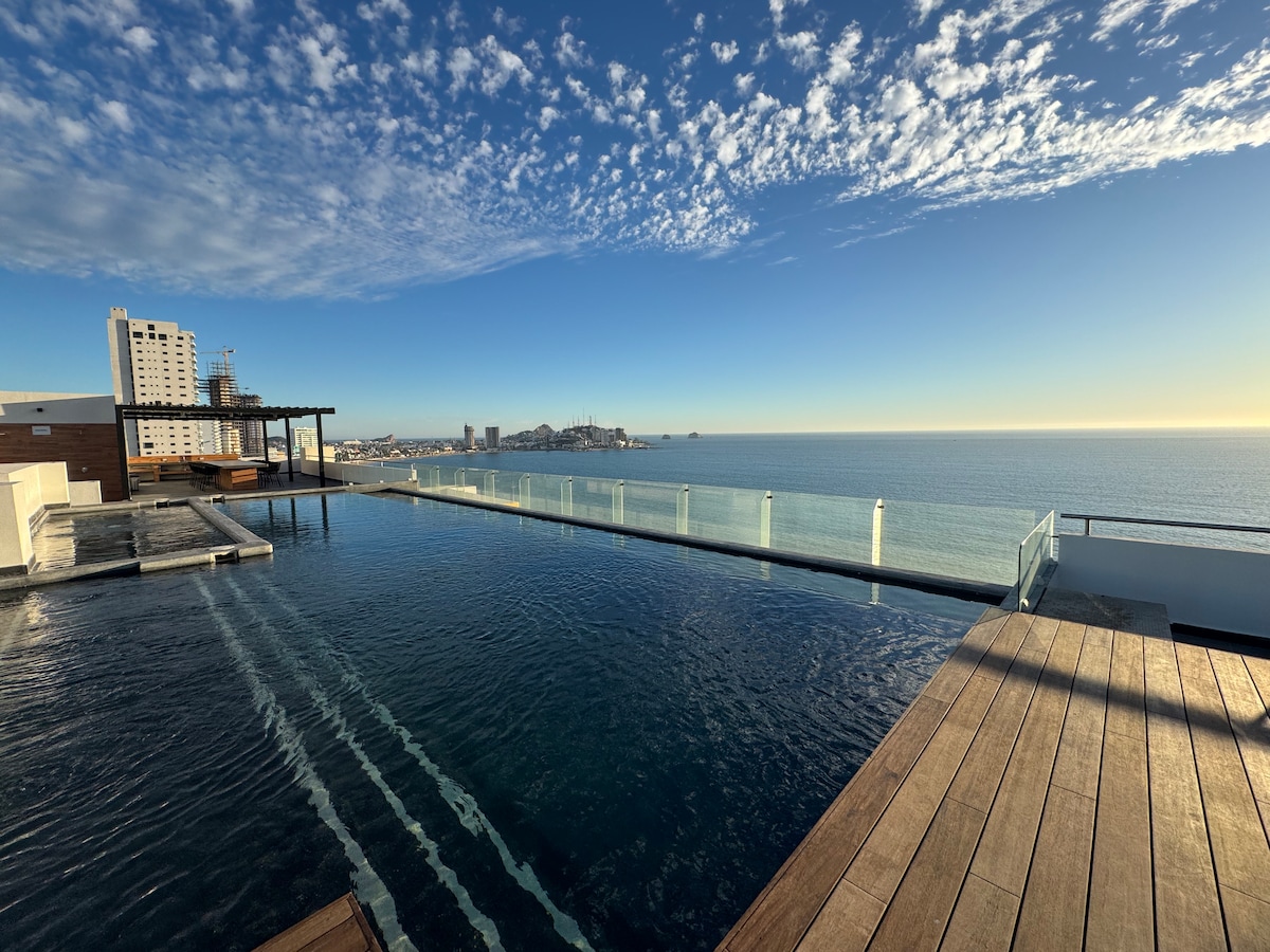 Experience Mazatlan from the heights in this exclusive apartment. Enjoy luxury finishes, 2 bedrooms with queen size beds and TV, a spacious living room with oceanfront balcony and a fully equipped kitchen. It also has a spectacular rooftop pool. Located in front of the Malecon and just steps from the Golden Zone, you will have immediate access to beaches, restaurants and nightlife. Ideal for those looking for comfort, incredible views and an unbeatable location.