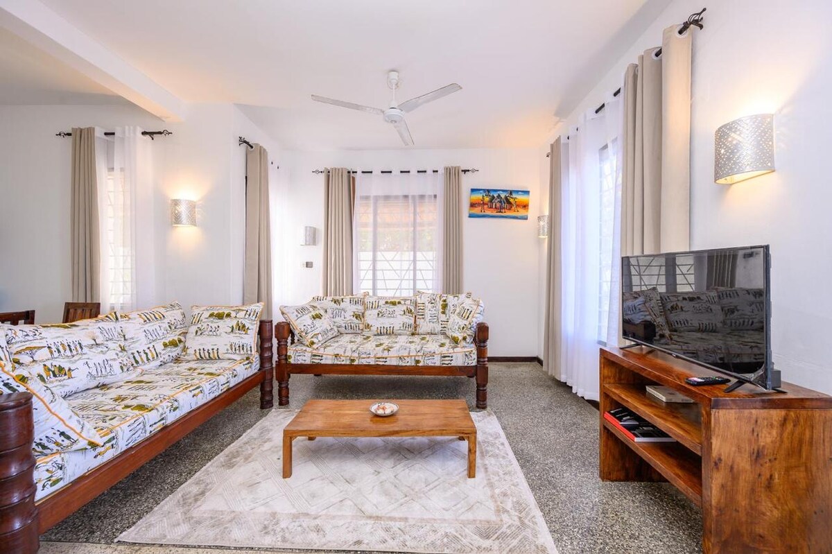 Denna eleganta villa med 4 sovrum ligger i det lugna Casuarina-området, omgiven av lummiga tropiska trädgårdar, bara 5 minuters promenad från Malindis finaste strand. Koppla av vid den privata poolen i rymliga utomhusboende. Fullt bemannad med en utmärkt privat kock som lagar färska och smakrika måltider.Ägarstyrd för sömlösa vistelser: förlagrade livsmedel, hjälp med utflykter (Marine Park, dhow-resor +). AC sovrum, Wi-Fi. Perfekt för par, familjer eller grupper som söker komfort och lätthet