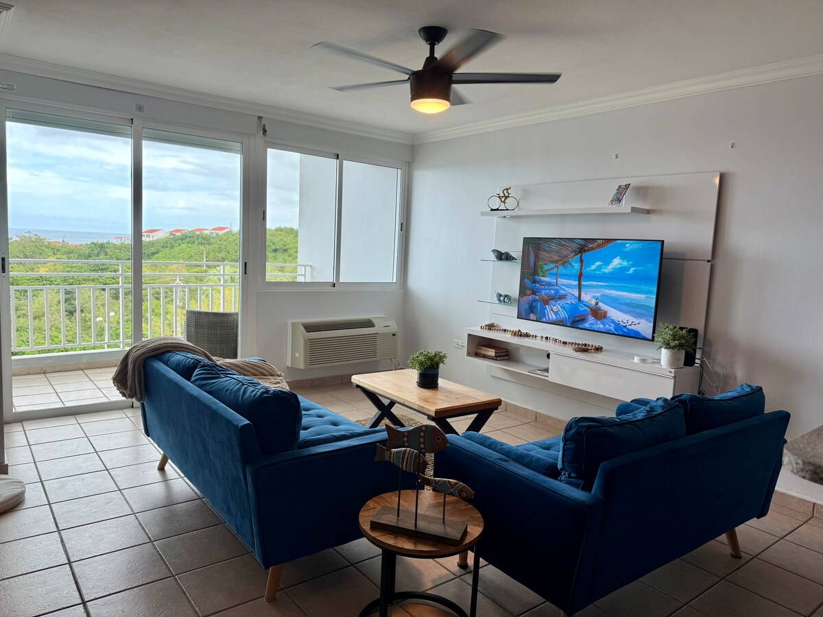BLUE SERENITY är en 3 BDR Penthouse Lägenhet med en rymlig takterrass med utsikt över havet. Njut av brisen och lugnet av att vara bredvid "El Yunque Rainforest" och den fantastiska utsikten över Atlanten. Endast 9 minuters bilresa från stranden och nära en mängd restauranger och sevärdheter; njut av tillgång till en gemensam pool och tennis/basketplan. En av få uthyrningar i området med en GENERATOR för inga strömavbrott under din semester!