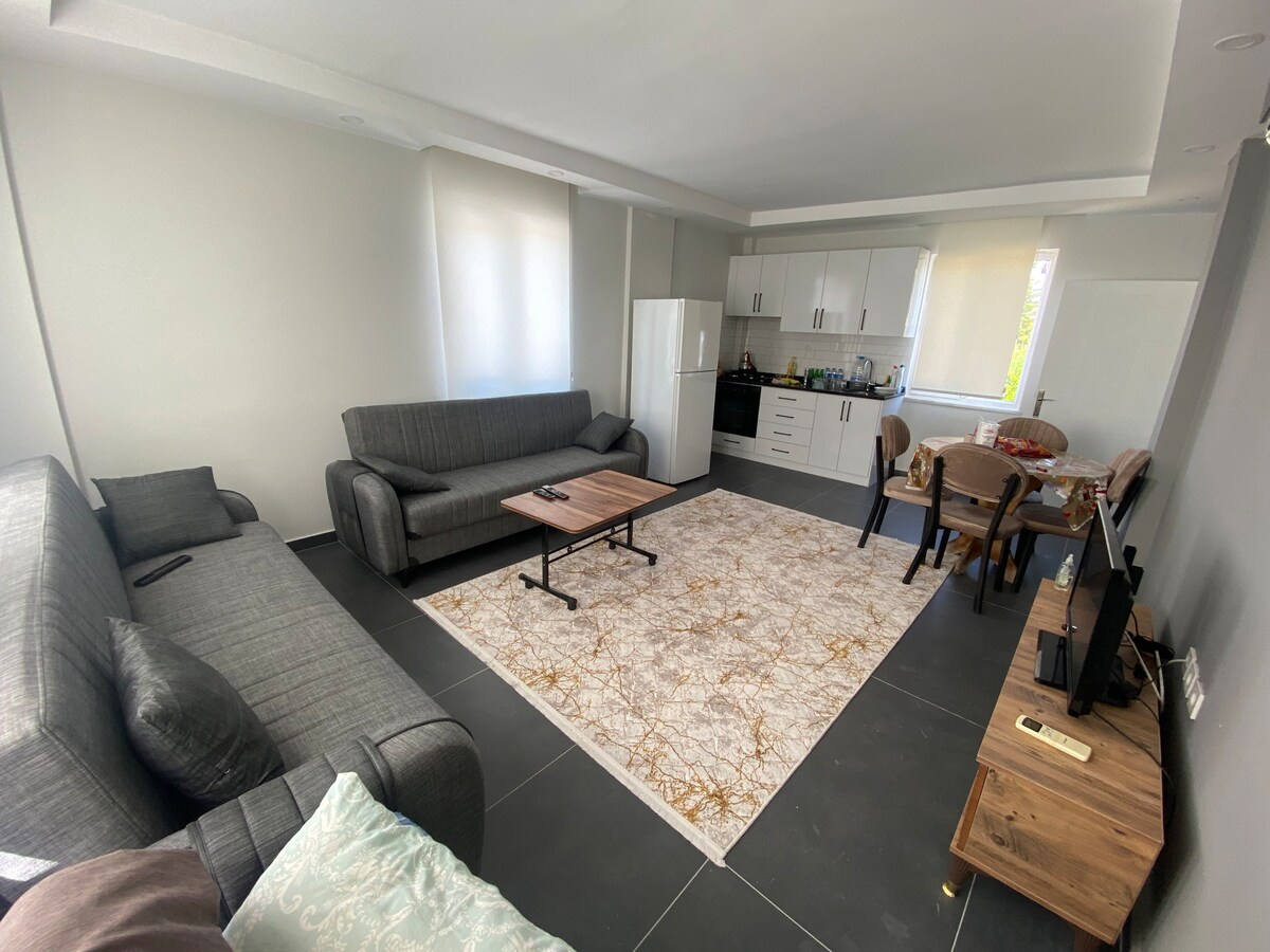 Strandnära lägenhet. Strandstranden ligger 50 meter bort. Det ligger i centrum av havet. Huset rymmer 5 personer. Köket är fullt,parkering, nära livsmedelsbutiken i det fridfulla området, 900 meter till den gamla stranden, mitt i 5-stjärniga hotell. Nära till Dolmus och bussapotek. 2 +1 lägenheter..