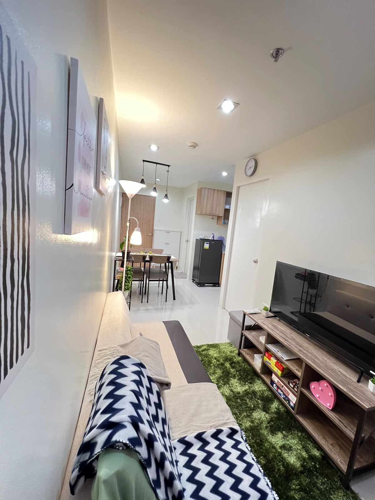 📍Midpoint Residences, Banilad, Mandaue City 2 vuxna, 1 barn - Dubbelrum (bra för två) - Inbyggt skåp - Bäddsoffa (bra för en) - Induktionsspis - Smart-TV med Netflix, Disney Plus och etc. - WIFI - Kök och matredskap - Brädspel - Strykbräda och strykjärn - Hårtork - Högt bord med utsikt över staden Bekvämligheter för ägarlägenheter inkluderar: - Gym - Grillgrop - Halv basketplan - GRATIS pool. - Roof Deck Lounge Gratis parkering gäller endast 3 timmar. Fri parkering för motorcykel