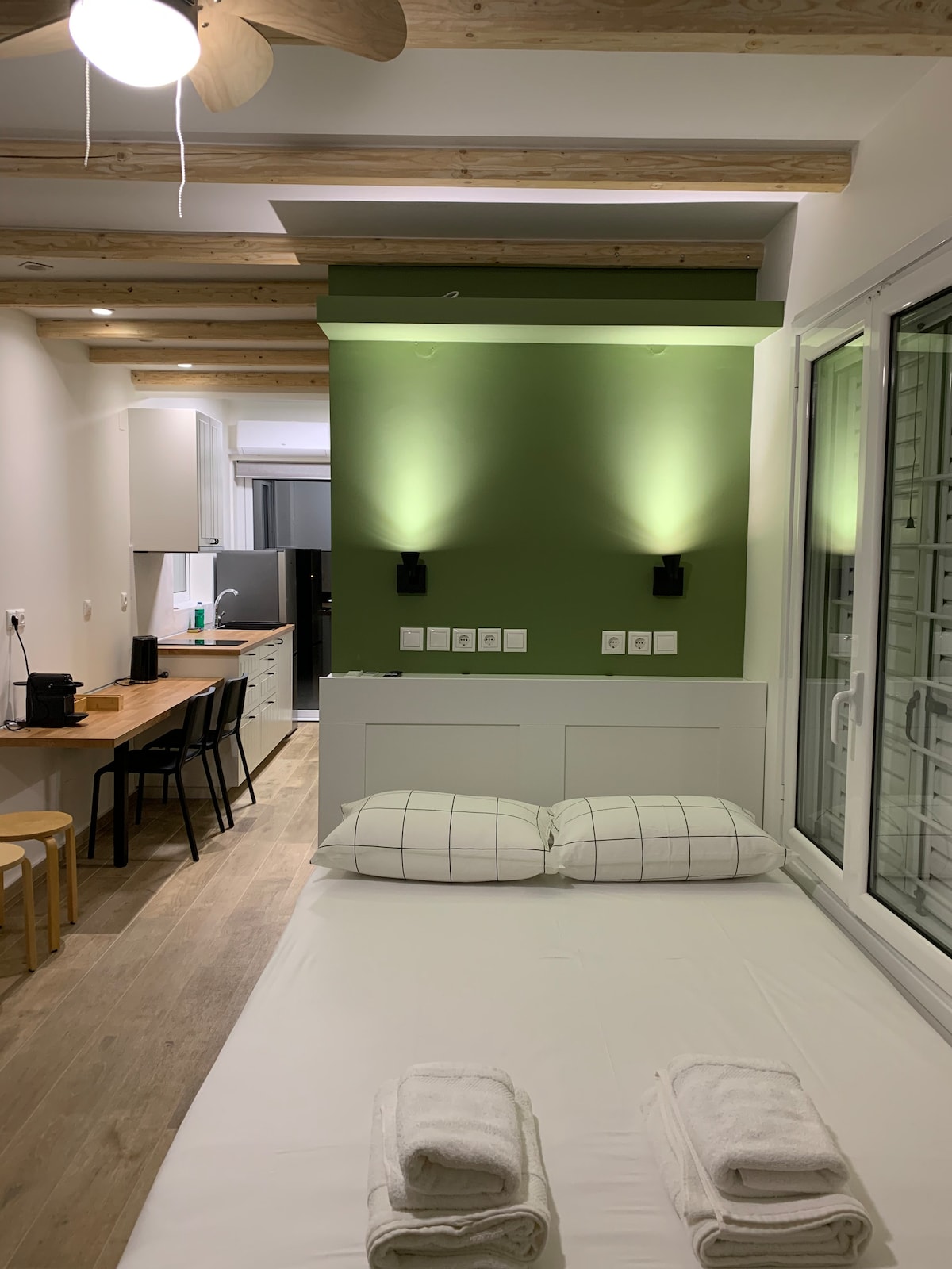 Modern och tidsenlig studiolägenhet bara 300 meter från stadens centrum och ett stenkast från strandvägen, där de flesta restauranger och kaféer i området ligger. Luftigt och vackert utrymme, som erbjuder alla bekvämligheter för den bästa möjliga vistelsen i vår stad! Den har en separat egen ingång och en vacker veranda. Den består av ett nästan självständigt sovrum, badrum och ett öppet utrymme som inkluderar en bäddsoffa och kök.