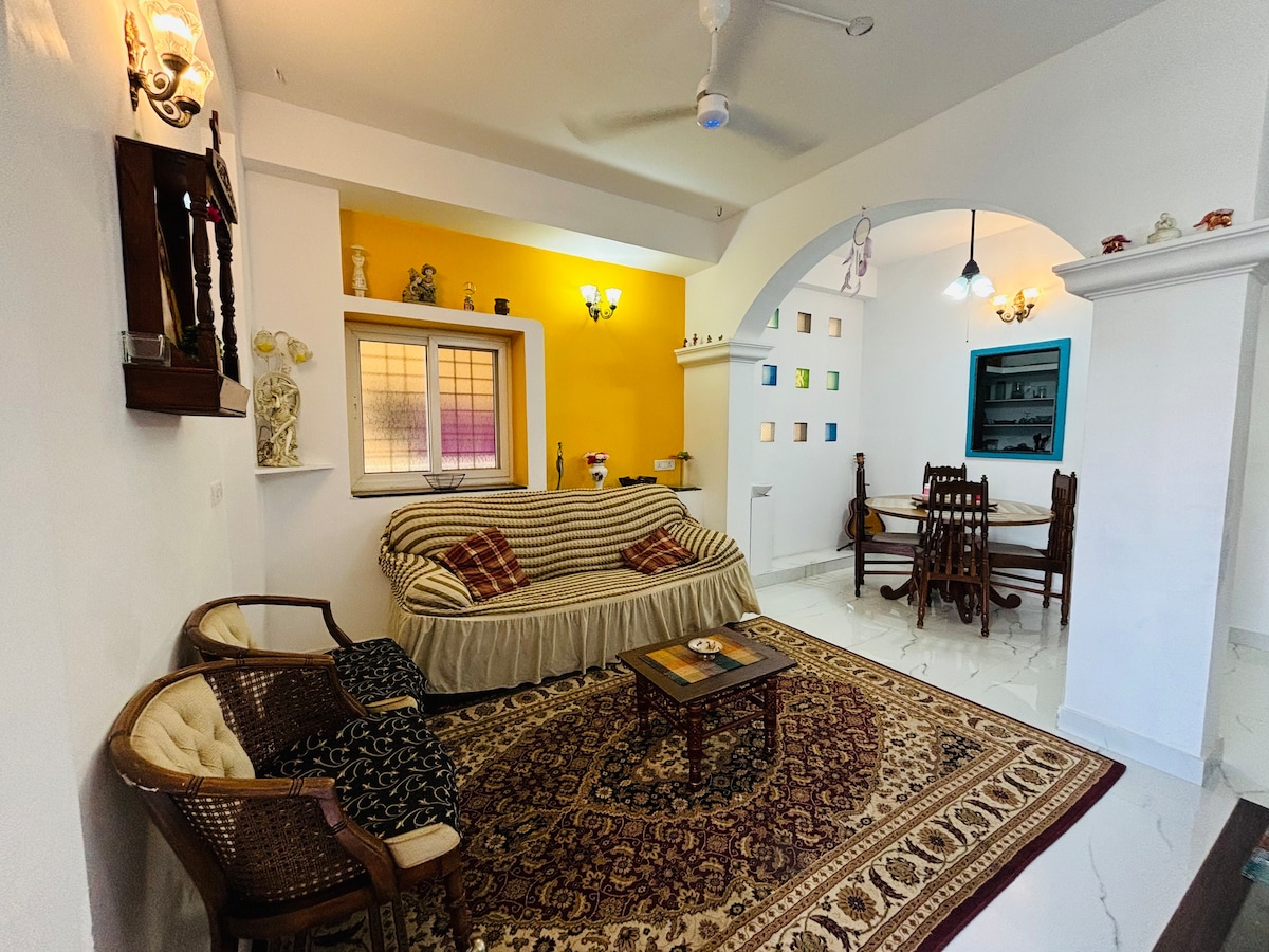 Ett centralt beläget hus med 1 sovrum (med bad, sittgrupp och kök) i ett lugnt, mestadels bostadsområde. Boendet Sovrummet inkluderar dubbelsäng i sovrummet med split enhet A/C, takfläktar. Hall med soffa 3, TV, Diwan Cot, avkopplande stolar, Wifi, hårtork och takfläkt. Köket är välutrustat för självläggning. Armaturer inkluderar 1 induktionsspis, kylskåp, mikrovågsugn, bestick och porslin för 6. Gäståtkomst Hela enheten med fullständig integritet med digital nyckelåtkomst.