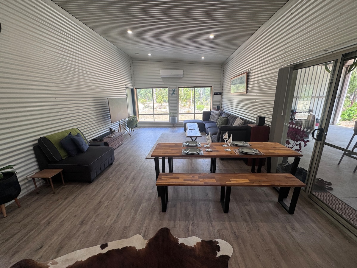 Located right in town, this charming retreat is just a three-minute walk from the brewery, the cafe strip, and an array of unique shops. The building itself is a beautifully recycled structure, renovated from the ('Lodge' built in 1936.) Surrounded by native trees, the property attracts a diverse and beautiful array of birds. Built as a working studio for displaying pottery and glass-blown art. Step across the footpath, and you’ll find yourself immersed in rolling meadows and pine forests.