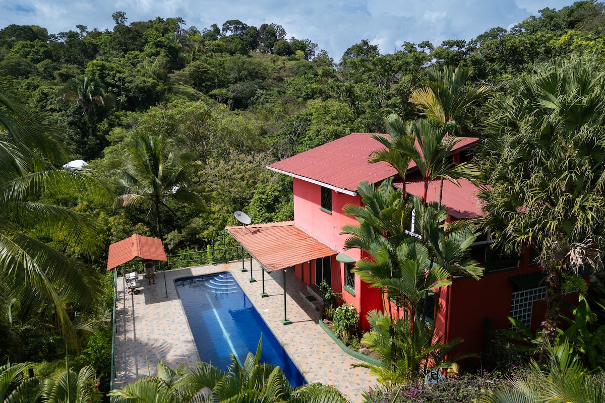 Privat 2 sovrum, 2 badrum inhägnad villa med infinity pool och hisnande hav + djungel utsikt nära Manuel Antonio. Njut av sömlöst inomhus-utomhusboende, luftkonditionering, snabbt Wi-Fi, Smart-TV och ett fullt utrustat kök. Perfekt för par eller familjer. Minuter från stränder, surf och vattenfall. Låt oss ta hand om detaljerna. Vi ordnar gärna privata kockar, massage i hemmet, livsmedelslager, turer och transport så att du helt enkelt kan koppla av och njuta av din vistelse.