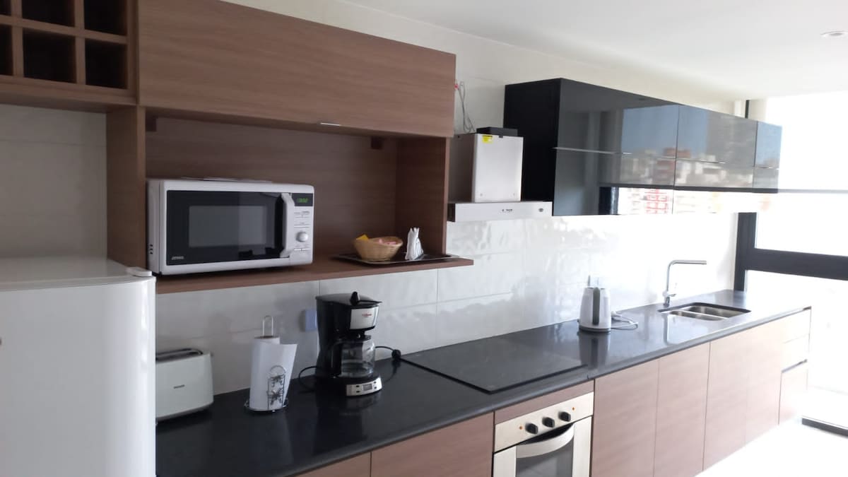 Helt ny lägenhet, rymlig, ljus och modern. Den har 2 balkonger: en med egen grill och den andra i sovrummet med utsikt över havet. Den har ett eget badrum och toalett. Vardagsrum med soffa, luftkonditionering och TV. Täckt garage ingår. Beläget i en lugn byggnad i ett bostadsområde, några kvarter från Playa Grande och nära till gastronomiska och nattlivet i Alem. Perfekt för att koppla av och njuta av Mar del Plata som ett par eller en liten familj.