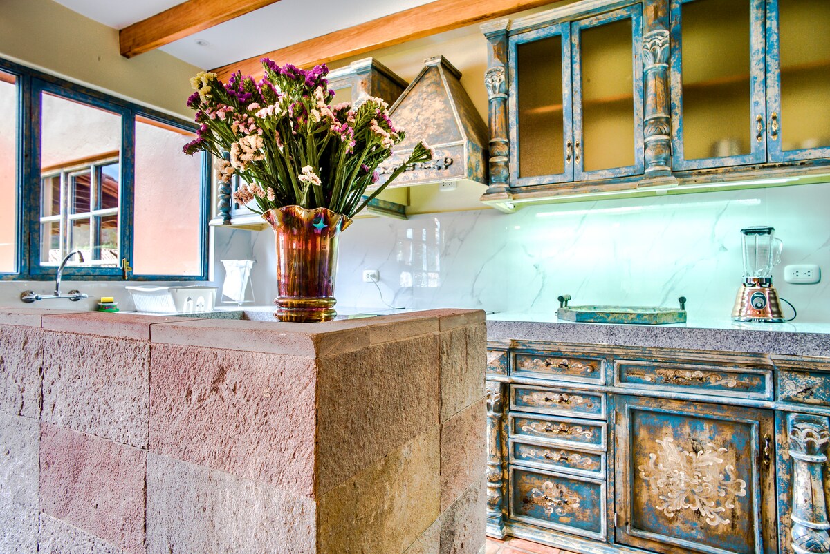 This villa has stunning panoramic views of the mountains It is an ideal place to rest and recharge your batteries, or to work remotely while enjoying the seclusion of the mountains. You can have breakfast in the garden and watch the hummingbirds and butterflies fly around. The villa has 2 bedrooms, the main one is a king size bedroom and the secondary one can be accommodated with a king size bed or 2 single beds. An additional sofa bed can also be fitted.