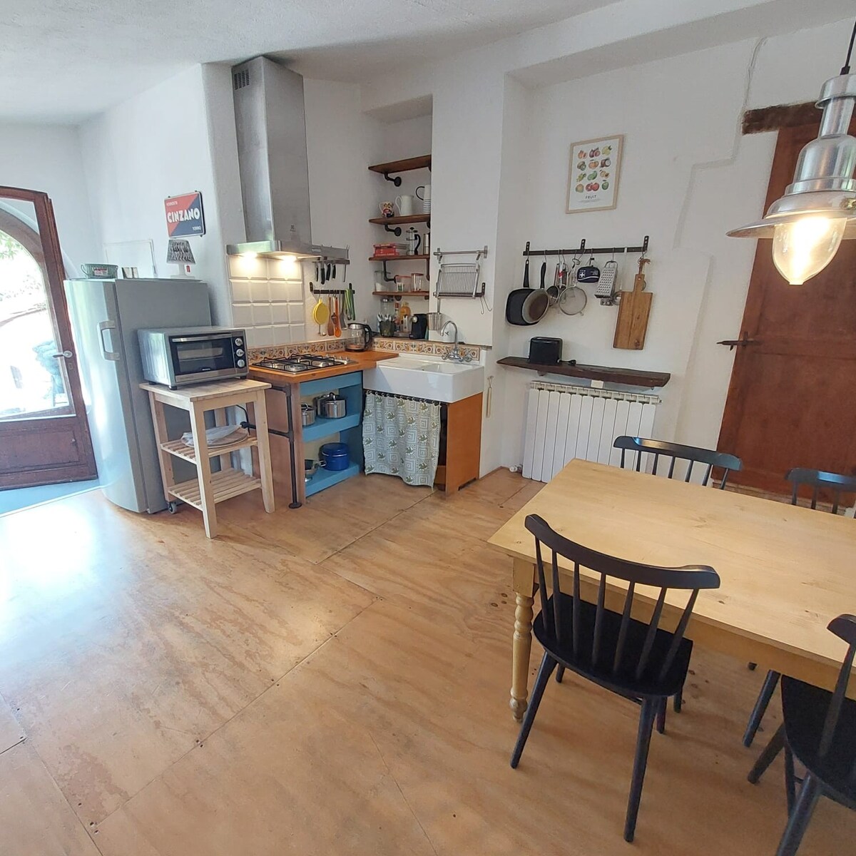 Denna 180 kvm lägenhet är gjord av huvuddelen av familjen Gaggias hus. Huset byggdes runt 1920-talet och ovanligt nog var huvudrummet på marken. Fokus låg på den stora eldstaden som hade två bänksäten inom sin struktur. Vi gjorde det till en prioritet när vi återställde boendet. Den största ändringen som krävdes var att skapa nya trappor som vi gjorde i ett stall på baksidan av fastigheten som nu har 3 meter hög spegel.