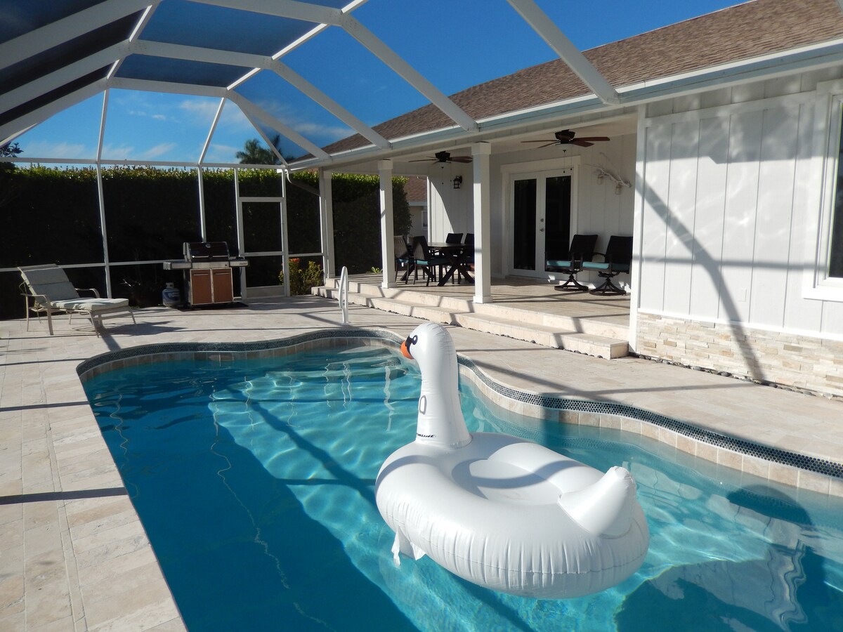 Vackert inrett fiske, hav, hem med strandtema. Visas på HGTV. Renoverat och beläget på Marcos enda golfbana. Privat uppvärmd pool, bubbelpool, gourmetkök. Vi har ett privat inhägnat sidostaket som rymmer ditt privata fiskefartyg om du så önskar. Beläget bara 3-5 minuter från stranden, butiker, parker och restauranger. Offentliga båtramper ger enkel tillgång till de 10 000 öarna och Everglades National Park ligger bara 45 minuters bilresa bort. Njut! Det är en ö tillflyktsort!
