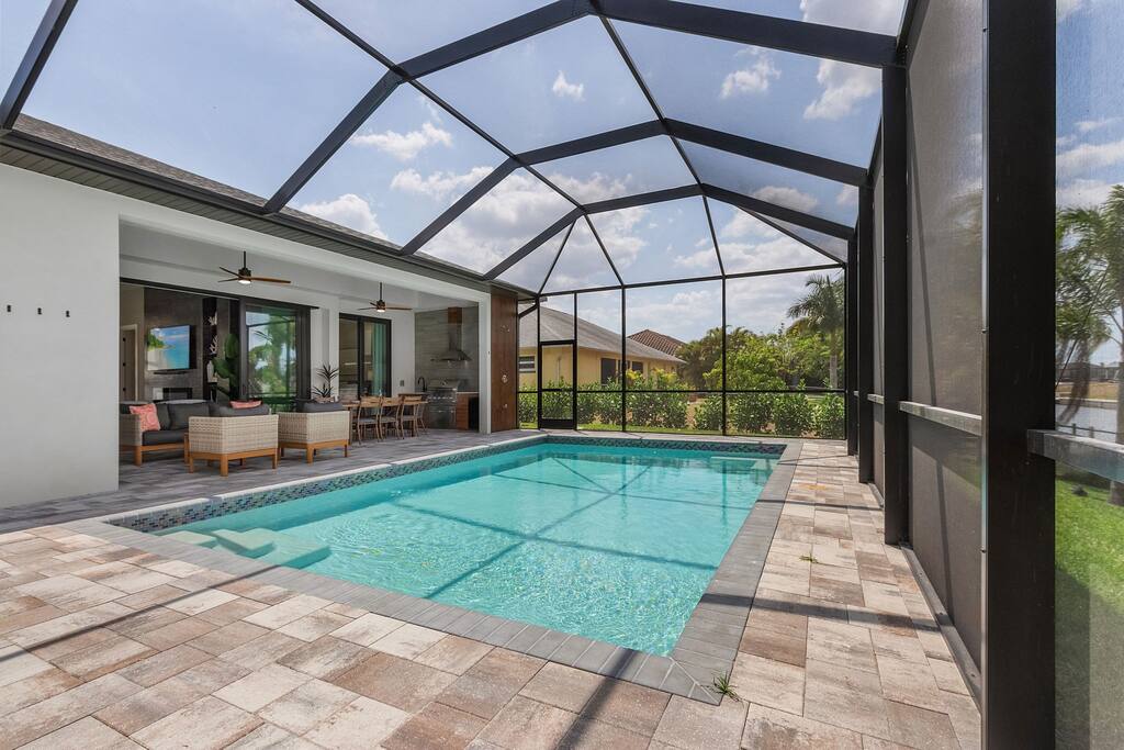 EN AV DE BÄSTA VATTENFRONTERNA I CAPE CORAL! En kort promenad till stranden a. Detta 2 500 + kvm stora boende har fantastiska solnedgångar och sydvästlig vattenutsikt från alla stora vardagsrum, samt Master Suite. Uppvärmd pool med LED-färgad belysning, inbyggt spa, poolbad, full tvättstuga, Lanai, öppen spis, Wi-Fi och TV i varje sovrum, privat brygga. Båt på hiss att hyra med RPM uthyrning. Stort garage för 2 bilar med 5 cyklar, strandvagn och kylare på plats.