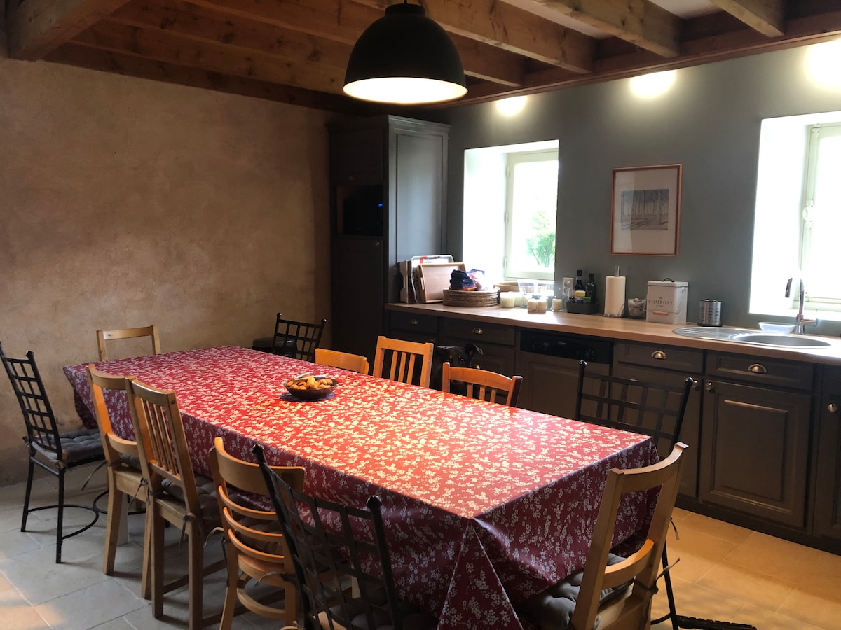 Ett vackert medeltida hus, centralt beläget i en av de 100 vackraste byarna i Frankrike, med lokala bekvämligheter och bra restauranger bara 1 minuters promenad! Härlig mjuk inredning, värme och en mysig vedbrännare gör detta till ett idealiskt "hem utanför hemmet" för vinter- och vårledighet också. Arbeta på distans med wifi (fiber finns här) om du behöver, och njut av många vackra promenader i närheten. Njut av morgonkaffe i den solbelysta loungen, lyssna på hjärtslaget i byns uppvaknande, andas bara djupt!