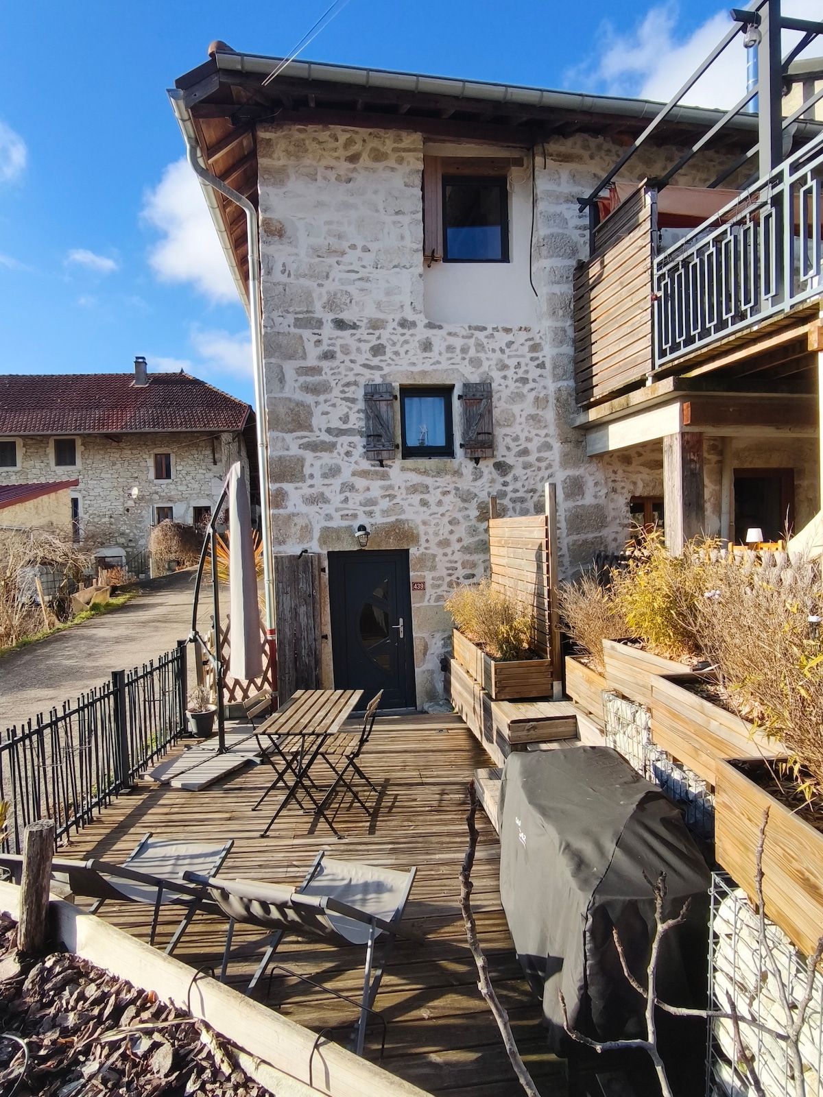 Beläget i Ain, i Arboys-en-Bugey, nära Belley. En lugn och avkopplande plats mellan sjöar och berg. Vårt hus kombinerar det moderna och det autentiska i en gammal möbeltapetserares butik. Du kommer att njuta av mycket stort utrymme både inomhus och utomhus. Den har en kapacitet på 1 till 16 personer med ett vardagsrum på över 60 m², 3 sovrum och 2 badrum. Stugan ligger intill vårt hus men utan att vara mitt emot. Ingången och parkeringen är oberoende.