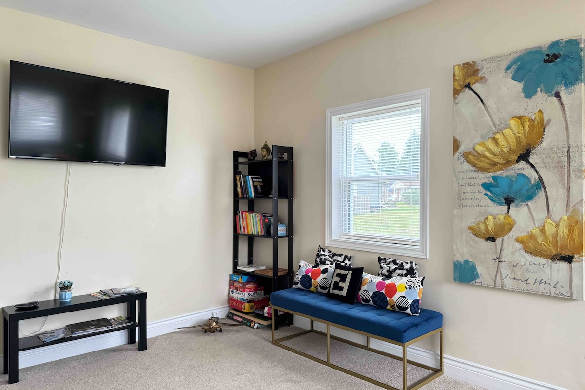 Nybyggd lägenhet perfekt för par eller små familjer precis utanför QEW. Helt nya apparater. Sovplatser 4 — Queen-säng och Queen-bäddsoffa med extra kuddar och filtar. Smart-TV där du kan komma åt Netflix, Amazon Prime, Disney samt livekanaler. Beläget 5 minuters bilresa från Falls, Casino och Attractions samt Niagara on the Lake och Winery Tours. Livsmedel, shopping, restauranger mindre än 5 minuters bilresa.
