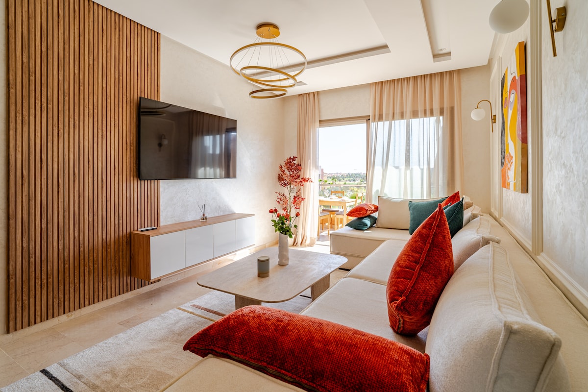 Modern lägenhet i hjärtat av Marrakech, belägen i den prestigefyllda Résidence Prestigia, säker och angränsande till en golfbana. Perfekt beläget: 5 minuter från flygplatsen och Menara-centret, 9 minuter från Jamaa el Fna. Residensen erbjuder grönområden, en sjö och en lekplats för barn. Lägenheten har en terrass med jacuzzi och poolutsikt, 2 bekväma sovrum, ett utrustat kök, ett vardagsrum med Netflix och luftkonditionering. Lyx och lugn för en perfekt vistelse!
