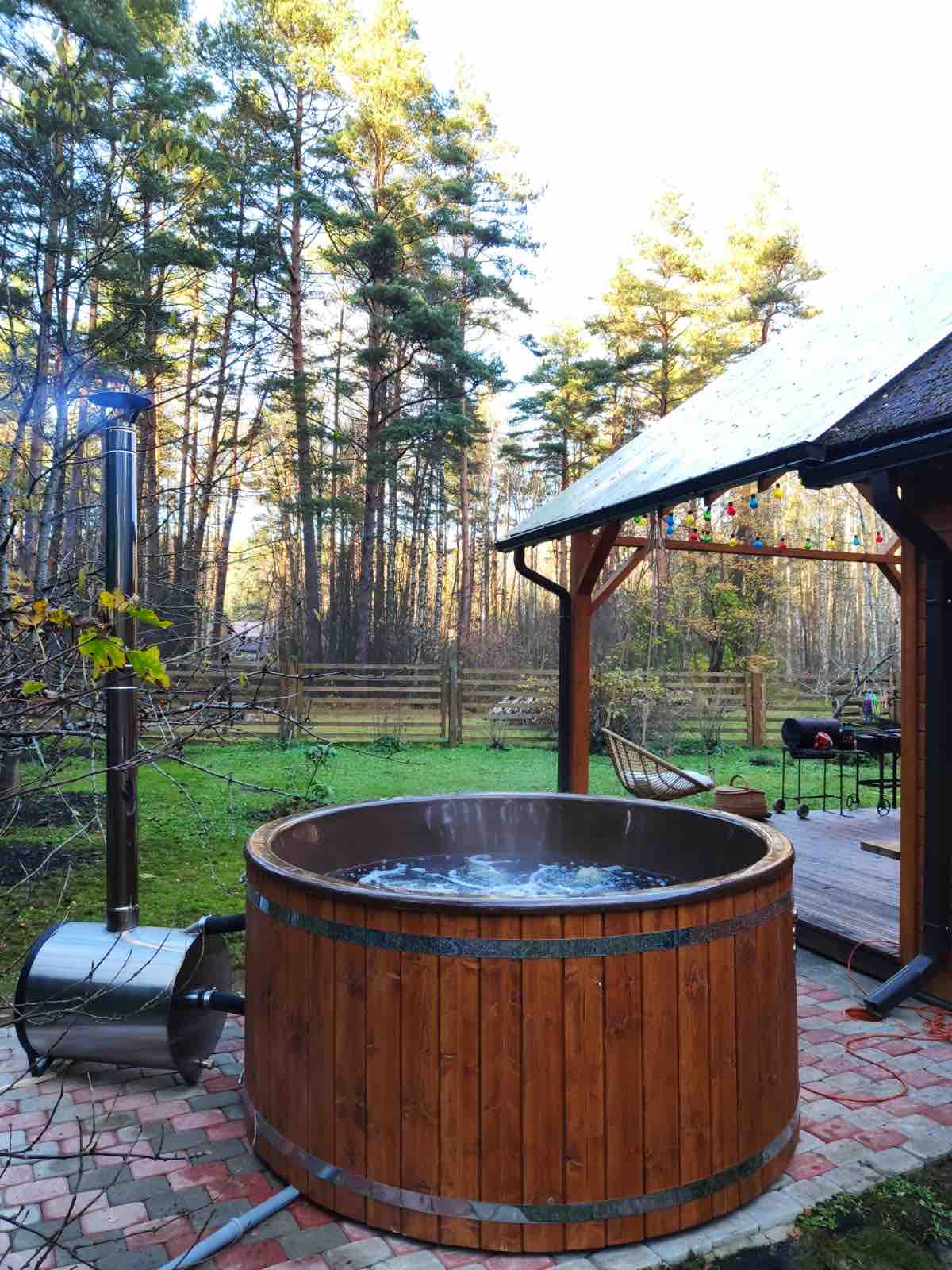 Mysigt hus i skogen med utomhusbubbelbad