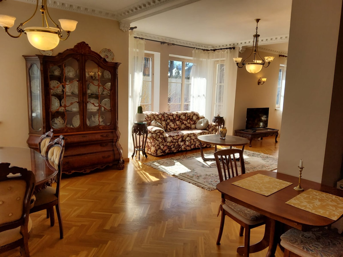 Fullt utrustad rymlig lägenhet — 120 kvm i ett privat hus. Beläget på en lugn, vacker plats, nära naturen i Bierini park. Flygplatsen (RIX) ligger bara 7,6 km bort, centrum och Gamla stan 5 km. Lägenheten har egen ingång. Det finns 2 separata sovrum, ett stort rum av studiotyp med ett kök, ett vardagsrum, ett basturum, ett stort elegant badrum med ett bad "Love Story" för två och hydromassagedusch, och ett andra badrum med dusch/wc.