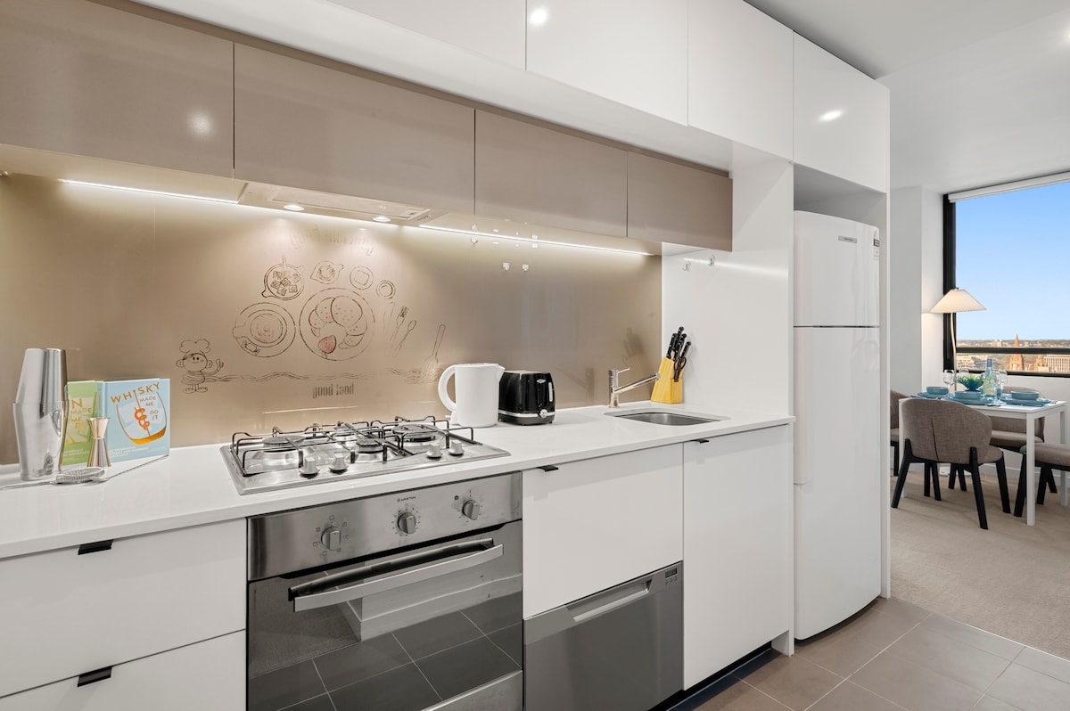 Bo i denna underbara, moderna lägenhet med 2 sovrum och 1 badrum några steg från Southern Cross Station i hjärtat av Melbournes CBD. Denna exklusiva bostad är perfekt för familjer, affärsresenärer eller par och erbjuder en elegant och bekväm tillflykt med förstklassiga möbler och fantastisk stadsutsikt. Med lyxiga detaljer överallt och ett oslagbart läge är detta den ultimata destinationen för dem som söker elegans och bekvämlighet i Melbourne.