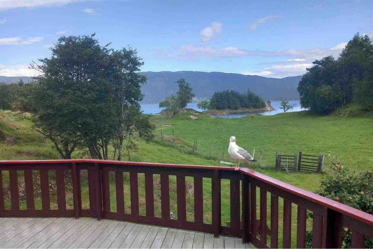 Ligger mitt i Bergen och Førde. Rymligt hus från 2011 med underbar utsikt i alla riktningar, sol från morgon till kväll, lugnt och barnvänligt! Gästerna påpekar att det faktiskt är mycket vackrare i verkligheten än på fotona! Omedelbar närhet till fjord, berg och djurliv! Sover bra för arbetare eftersom det finns 5 separata sovrum med mycket bra sängar!