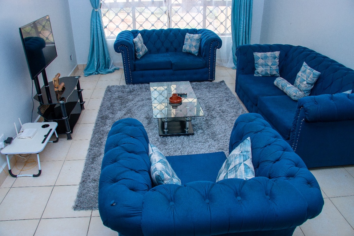 Vi erbjuder fullt möblerade 3-BR-lägenheter komplett med följande bekvämligheter; 10 minuters bilresa från flygplatsen(JKIA) 5 minuters bilresa till SGR Athi River Terminus Tillförlitlig kundtjänst Rymligt fullt möblerat kök Hushållning 3 gånger i veckan. 3Bedroom -Master Ensuite High Speed internetanslutning/Wi-Fi Gratis gott om gratis parkeringsplats Trygg och säker CCTV och säkerhet dygnet runt. Hög internethastighet Njut av en elegant upplevelse på detta centralt belägna ställe.