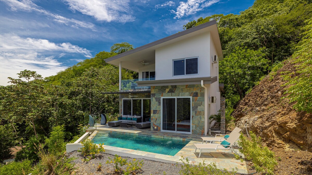 Vackert modernt boende med hisnande havs- och bergsutsikt, en privat infinity-pool, höghastighetsinternet på 100 Mbit/s och varmvatten. Rymligt inhägnat boende med omgivande mur och elektrisk grind för avskildhet och säkerhet. Bara en kort 450 meters promenad till stranden. Perfekt för avkopplande vistelser i ett lugnt grannskap. Endast 5 minuter med bil eller 20 minuters promenad till centrala Playas del Coco. Liberias internationella flygplats ligger 24 km bort, med direktflyg från USA och Kanada.