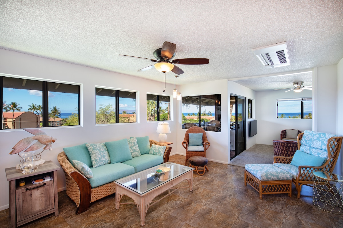 Denna hörntakvåning har utsikt över Molokini, Haleakala och Lanai. Titta på solnedgången eller månen stiga från 3:e våningen lanai. 1550 kvadratfot ger utrymme att breda ut sig eller samlas vid bordet som rymmer 8. Fem minuters promenad till Kam One eller Secret Beach. Titta på surfarna från ditt sovrum. Lugnt, bostadsområde, men ändå mycket nära till allt som händer i Kihei's Triangle District och Cove Park. Fantastiska trägolv, anpassad klädsel och kvalitetsmöbler överallt.