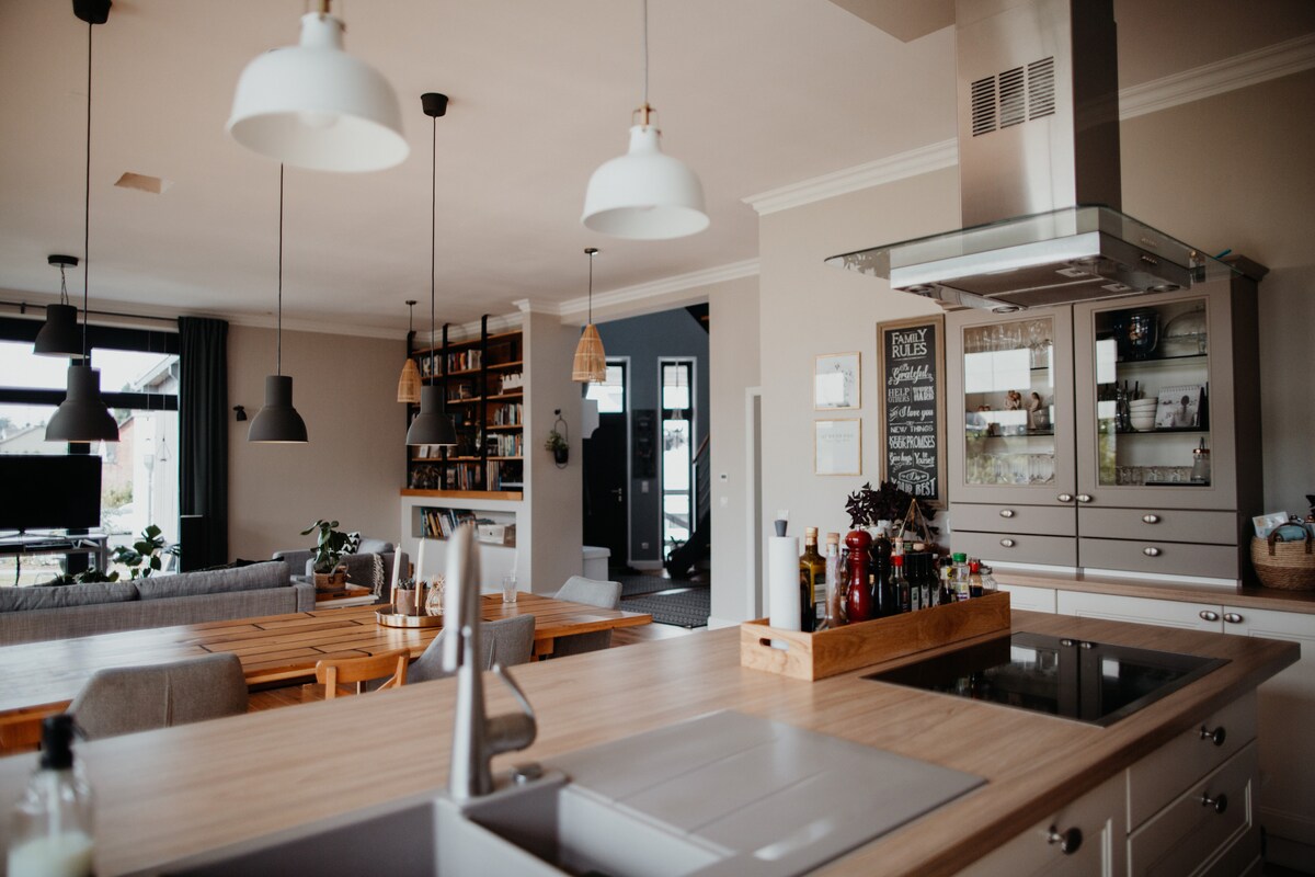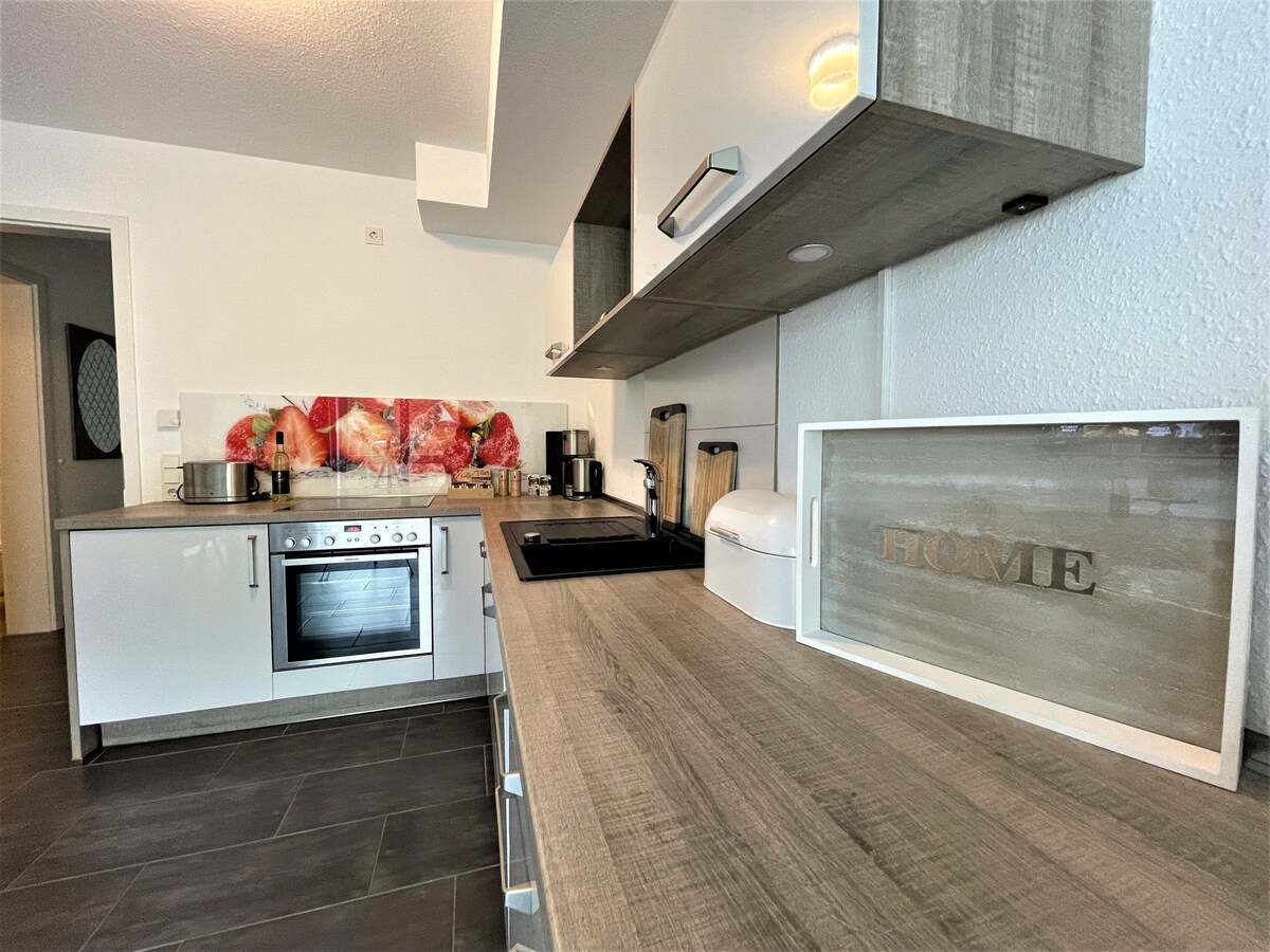 Upplev en oförglömlig vistelse i en elegant tillflyktsort! Njut av 4K laser hemmabio med Amazon Prime och popcornmaskin på mysiga Chesterfield-soffor. Sov bekvämt i king-size box-spring sängar. kök med gratis kaffe, te och picknickkorg. Ljus, beige design med en subtil vinstil som gör att du känner dig som hemma. Endast 2 minuter till järnvägsstationen och 3 minuter till Rewe stormarknad! Har du några frågor eller behöver du tips inför din vistelse? Vi finns här för dig – skriv bara till oss!
